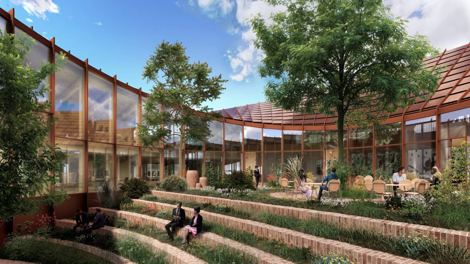 Acting as the green heart of the building, the courtyard draws in the surrounding landscape to its core and features an amphitheater to offer break-out areas or a gathering space for social events. Designed by BIG Landscape, the courtyard’s design is repeated in the office’s surrounding landscape, where green pockets for socializing are placed close to the entry area.