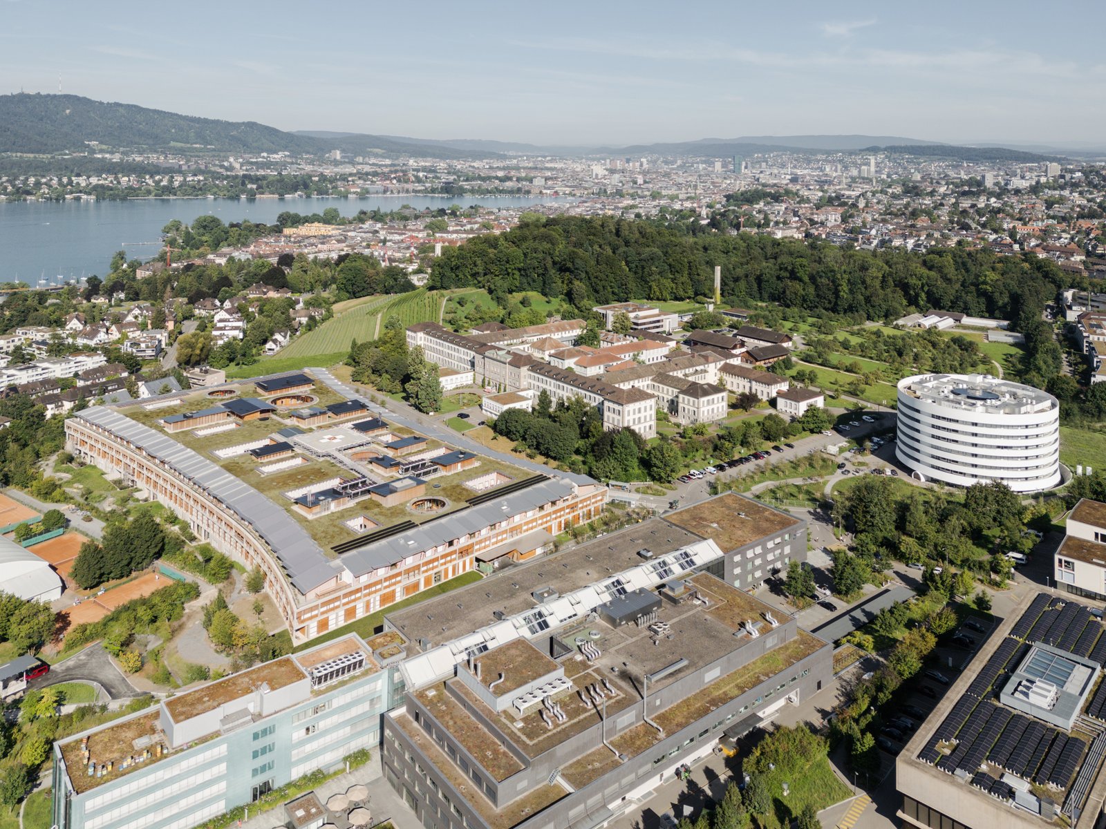 The rooms of the cylindrical, white building for research and teaching are organized around a central atrium, encouraging exchange and collaboration among researchers. An agora for teaching and study spreads out under this central space and responds directly to the surrounding landscape. Three lecture halls step into the natural slope of the terrain.