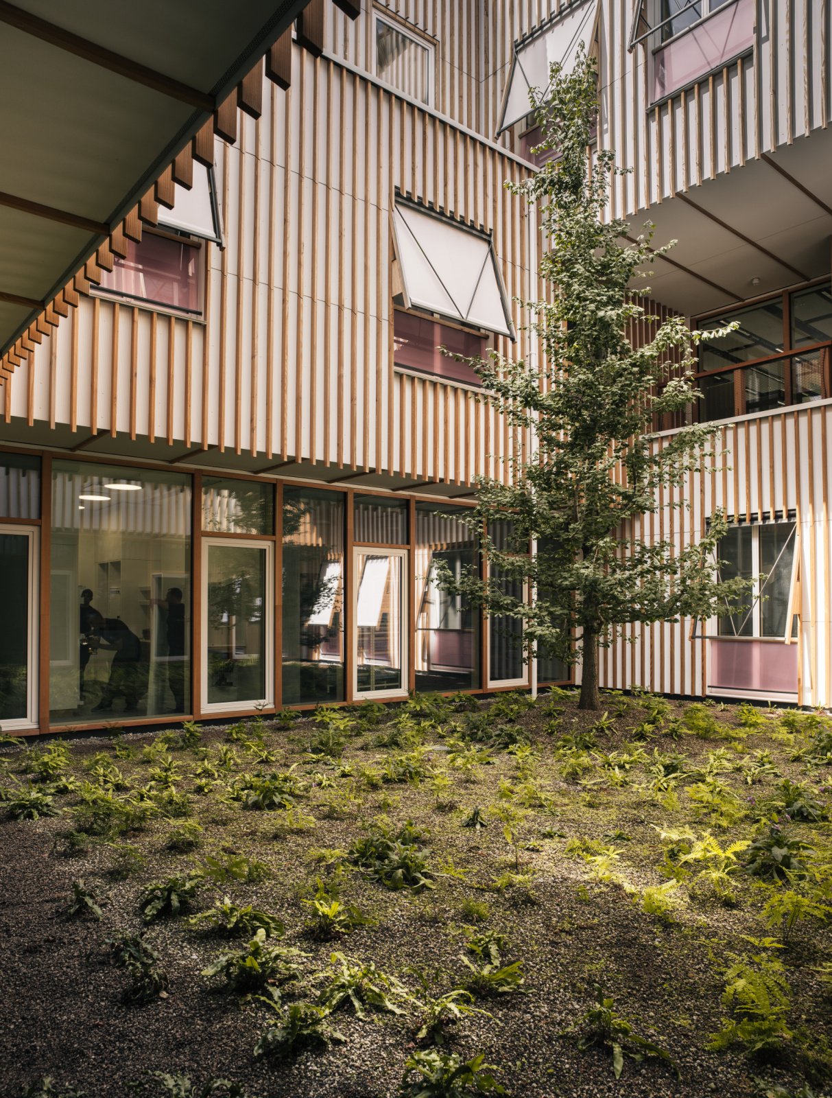 The top floor, the quietest area in the hospital, is reserved for children and adolescents, inpatients who are staying overnight or longer. Each of the 114 rooms is designed as a wooden cottage with a roof of its own, providing privacy, a view of the green outdoors and enough room for parents to spend the night with their children. There are four centers along the main street in the immediate vicinity of the cottages, where children and adolescents can receive transdisciplinary treatment.