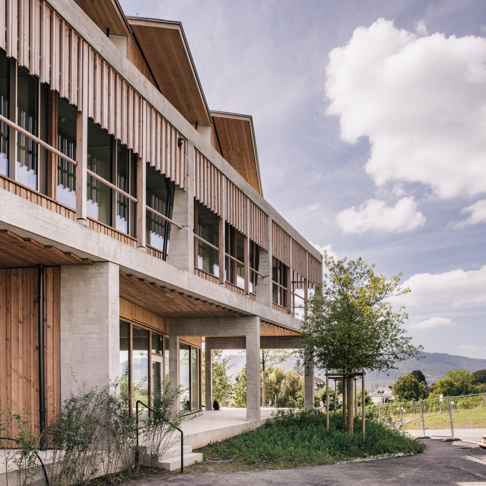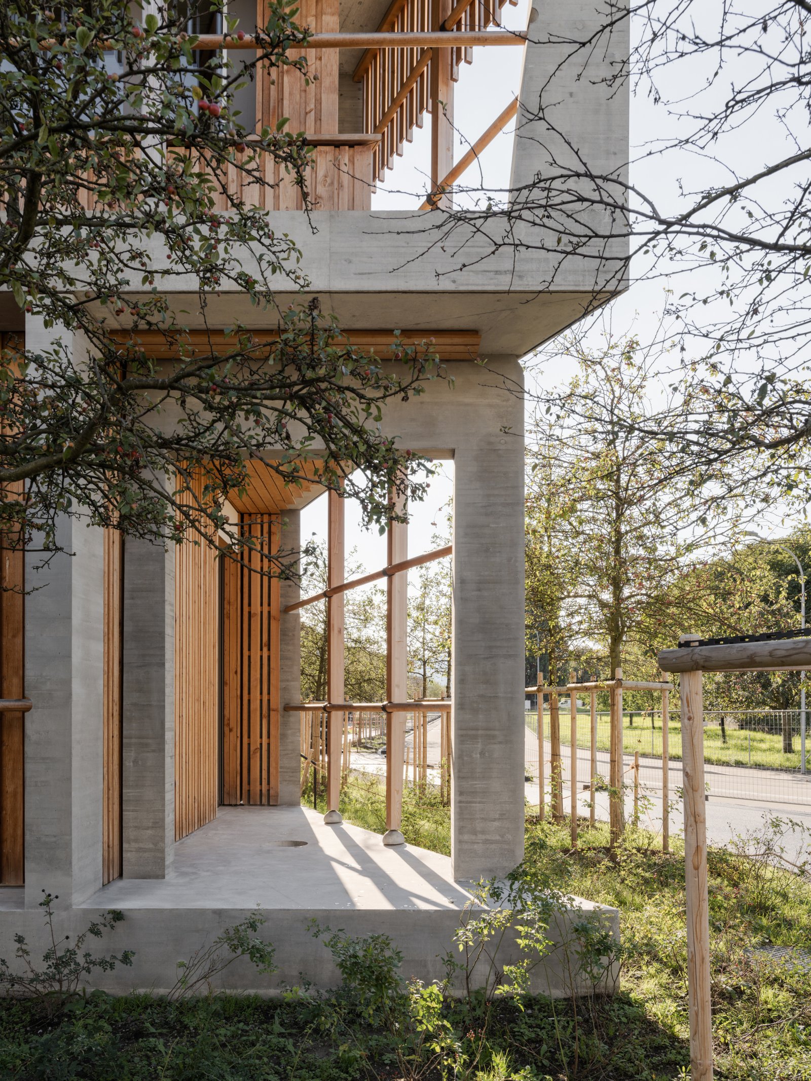 Embedded in an expansively designed landscape, the research and teaching building is a standalone structure in the midst of a fruit orchard similar to those in many Burghölzli gardens. The building itself speaks an abstract, clearly geometric language and makes use of few materials. Cantilevered balconies with tall railings painted white give the building the appearance of being both weighty and airy at once.