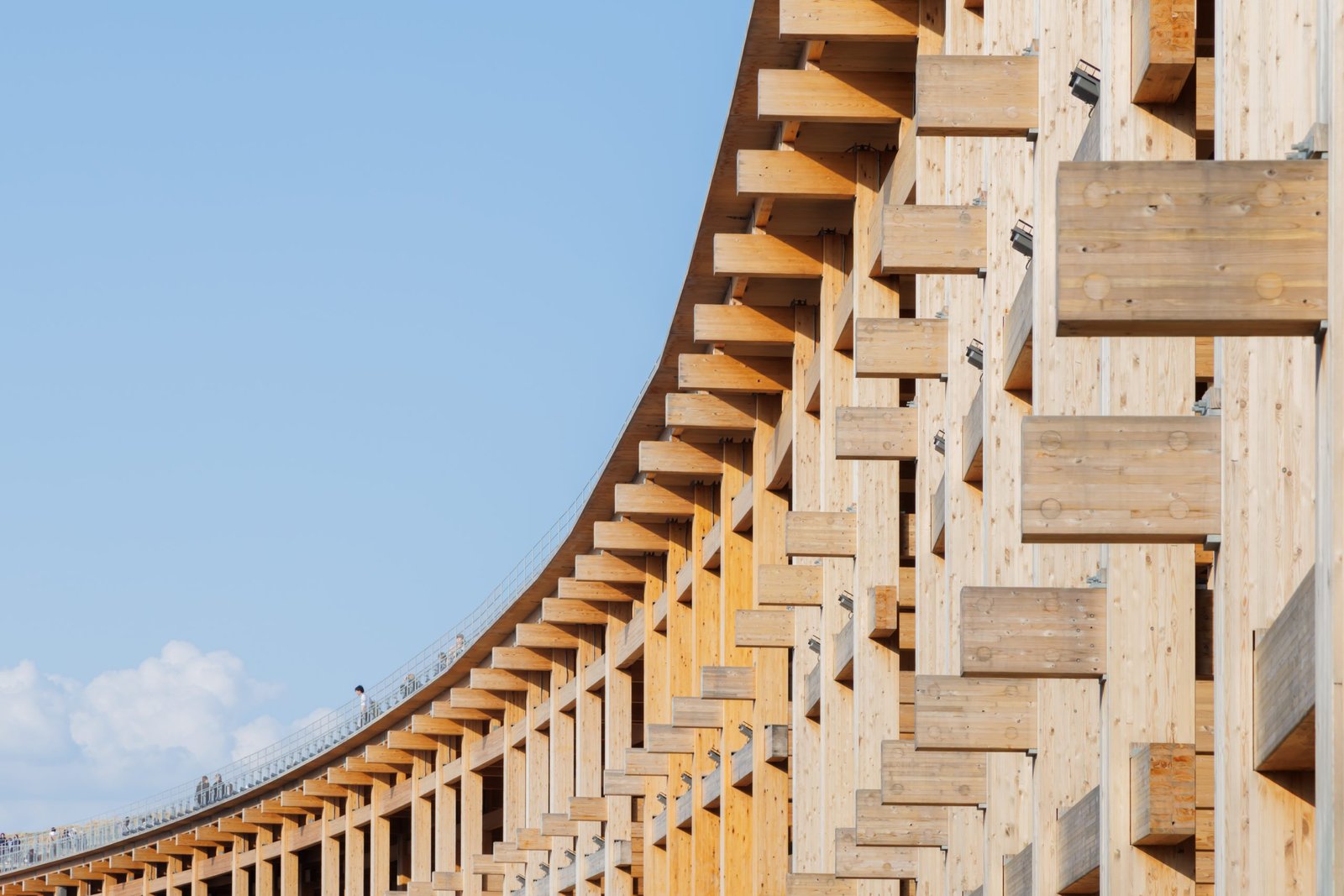 One of the biggest challenges the architects faced was procuring timber. The timber used for the main roof ring is around 27,000 cubic meters; it was not easy to procure a large amount of laminated timber with the appropriate strength to withstand a large-scale construction in such a short period of time that it would be ready in time for the opening. At the end, approximately 70% of the ring is made from domestic cedar and cypress, with the remaining 30% made from imported European red cedar.