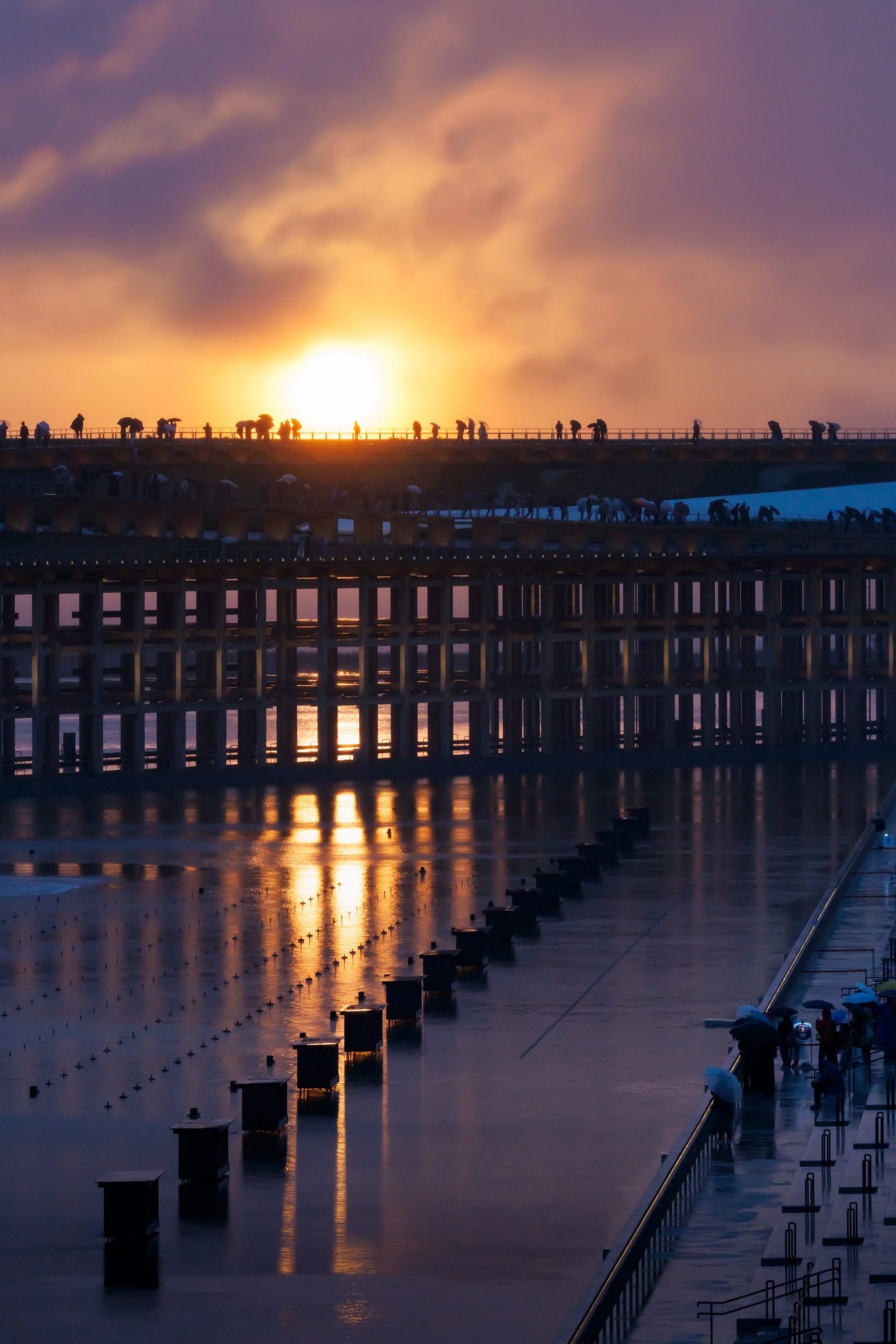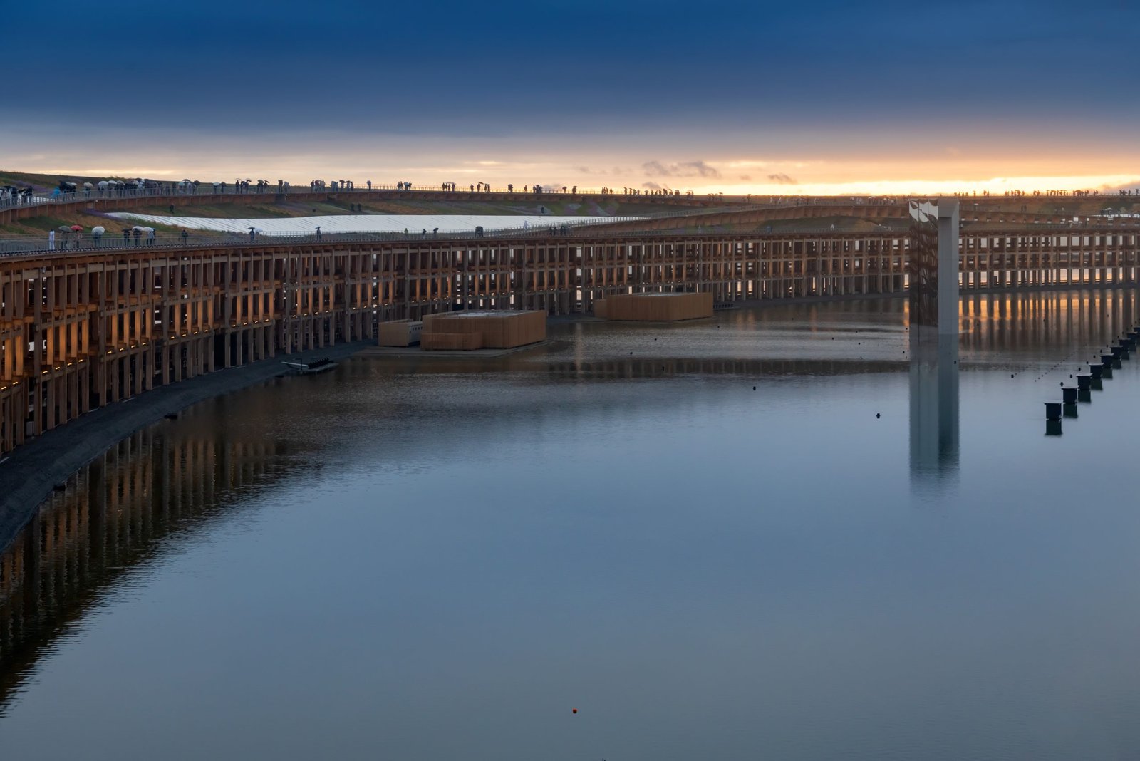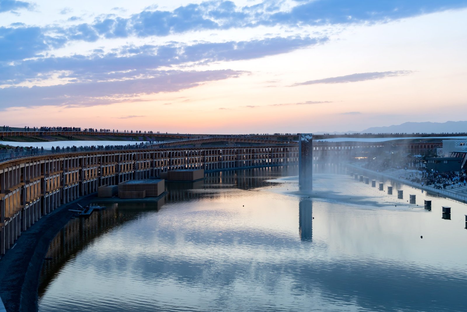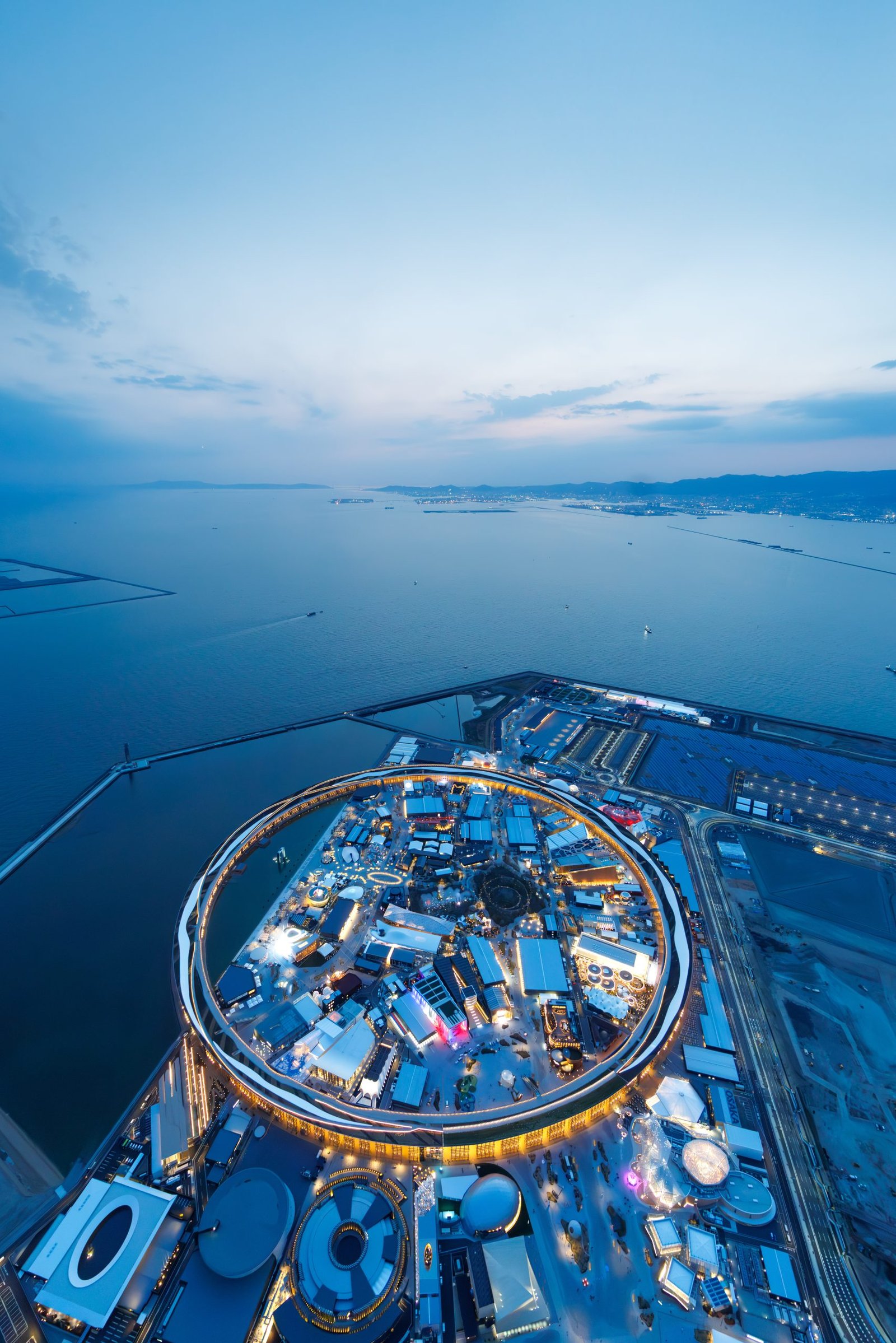 The circulation route, also referred to as The Ring Skywalk, is at an elevated height of 12 meters above the structure and accessible by escalators and lifts. There is also a lower and upper level, providing views out over Osaka and Osaka Bay, and back into the Expo site. From the ring-shaped aerial walkway, visitors can overlook the entire Expo from various points, and enjoy the calm water view of the Seto Inland Sea illuminated by the sunset. When the visitors looked up at the sky, they could see a clear beautiful cut of the sky. The architects wanted people to feel that this one sky is connecting all parts of the world full of diversity as is shared by everyone.