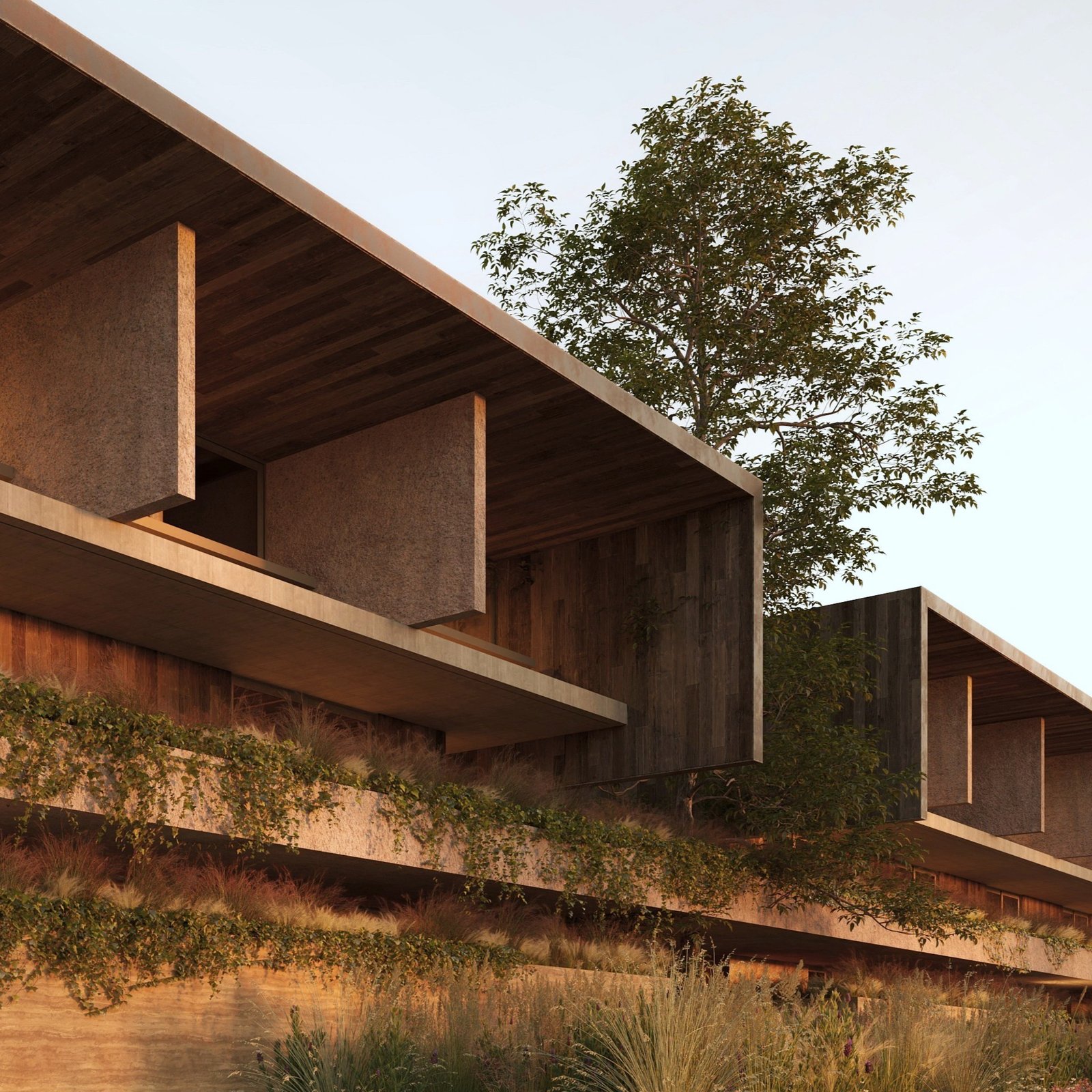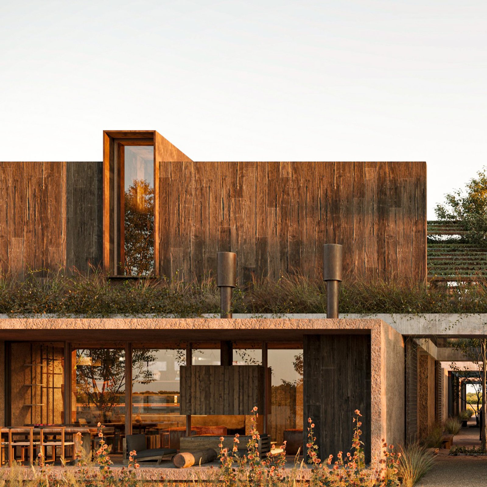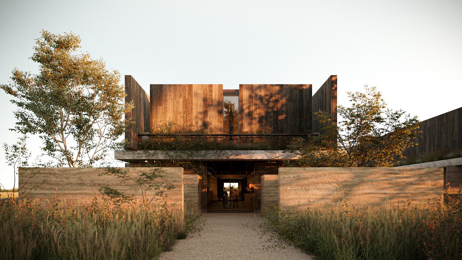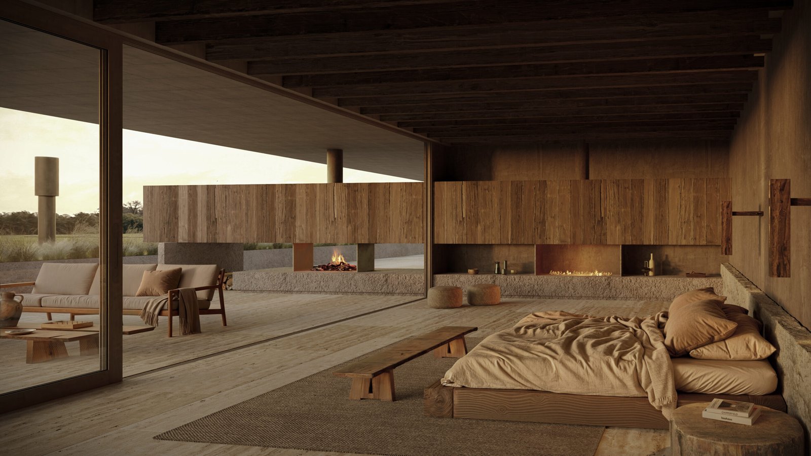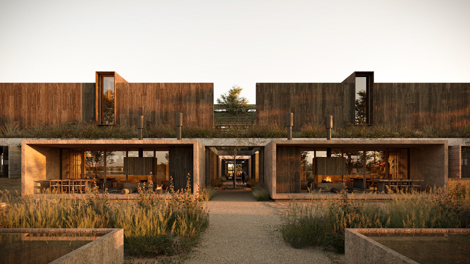 Resting above are volumes of locally sourced rustic timber, left untreated, intended to weather naturally and engage with time, climate, and the open landscape. Each design decision balances tradition and contemporaneity, with a focus on sensory experience.