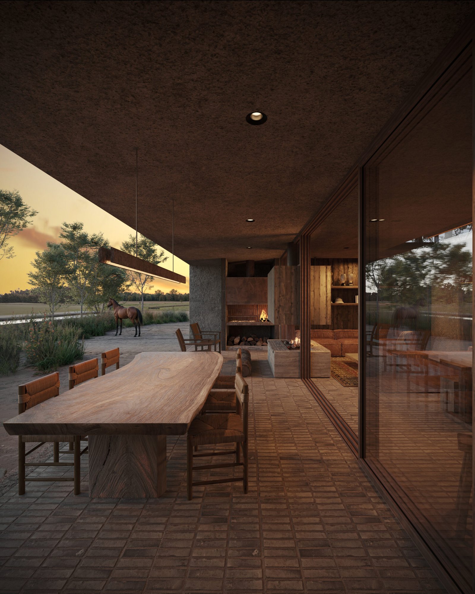 Llanura is a built manifesto grounded in the identity of the Argentine countryside. The architecture does not impose itself on the landscape; it emerges from it. A plinth of rammed-earth walls, made from soil extracted directly from the site, provides structure, texture, and a sense of belonging.