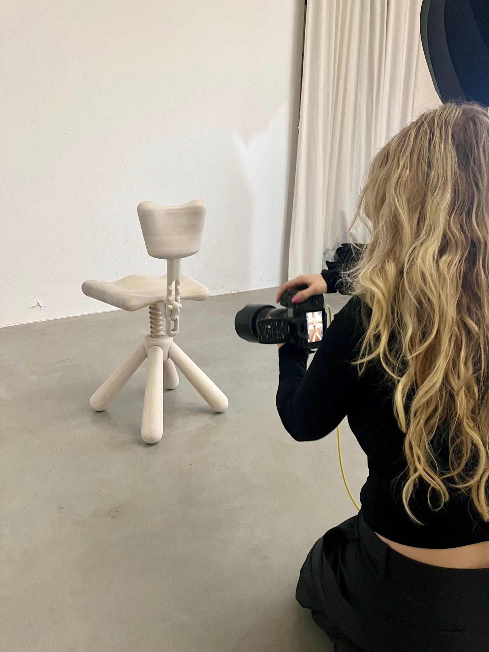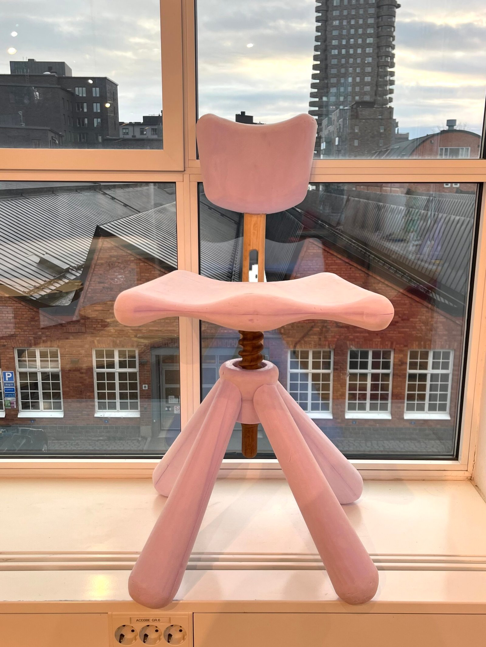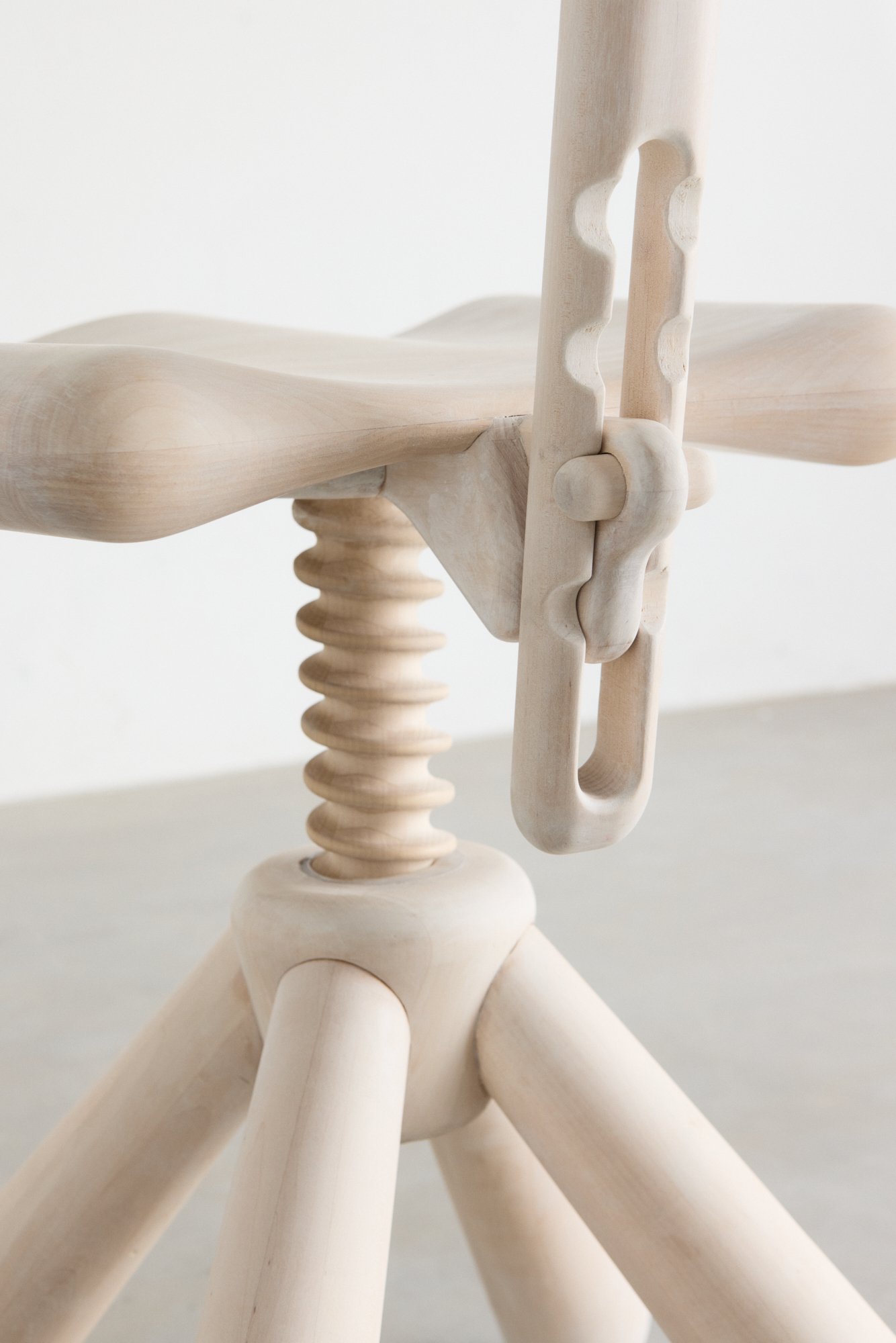 Crafting the giant screw mechanism that adjusts the seat height proved to be the most difficult aspect when working with timber. Given the high tooling costs, Owing to exorbitant tooling costs, Lundberg resorted to using a lathe to machine the bolt to millimeter precision, a task he described as ‘insanely hard’. The corresponding nut in the base of the chair was fabricated using 3D printing technology with plastic, serving as a proof of concept.