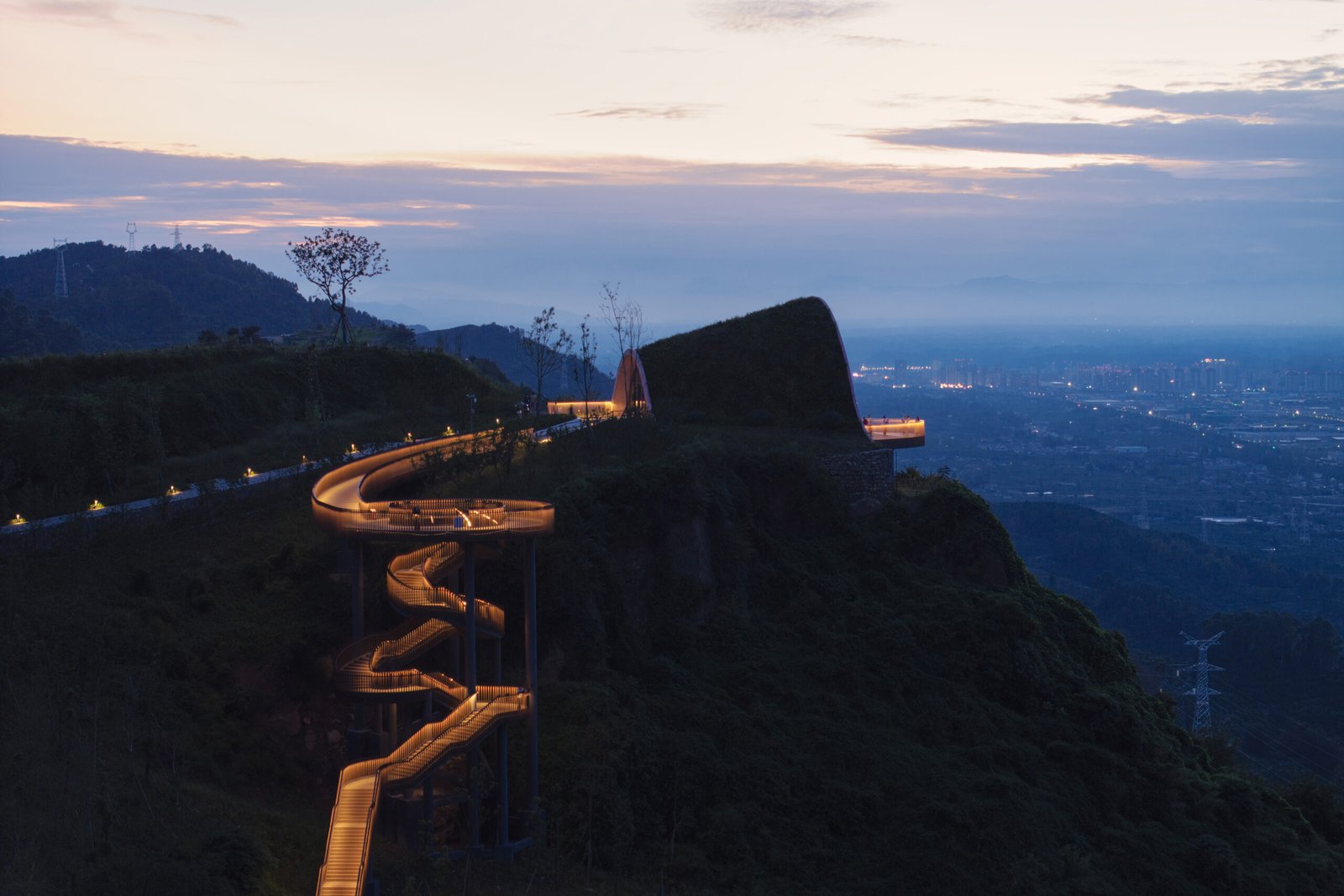 MVRDV’s design started from the revelation that the hill was flattened during the construction of the pre-existing viewing platform. By creating an arched pavilion covered with an earth berm that blends into the landscape, the design creates an echo of the hill that existed before. The design also improves the path network to add multiple routes to the viewpoint, including by adding a secondary viewing platform incorporated into a twisting staircase structure. The pavilion itself is made using a timber structure, serving as a demonstration to encourage greater adoption of wood in the Chinese construction industry; despite the benefits of wood in reducing the carbon emissions, Chinese regulations and industry at large remain hesitant to adopt the material at scale.