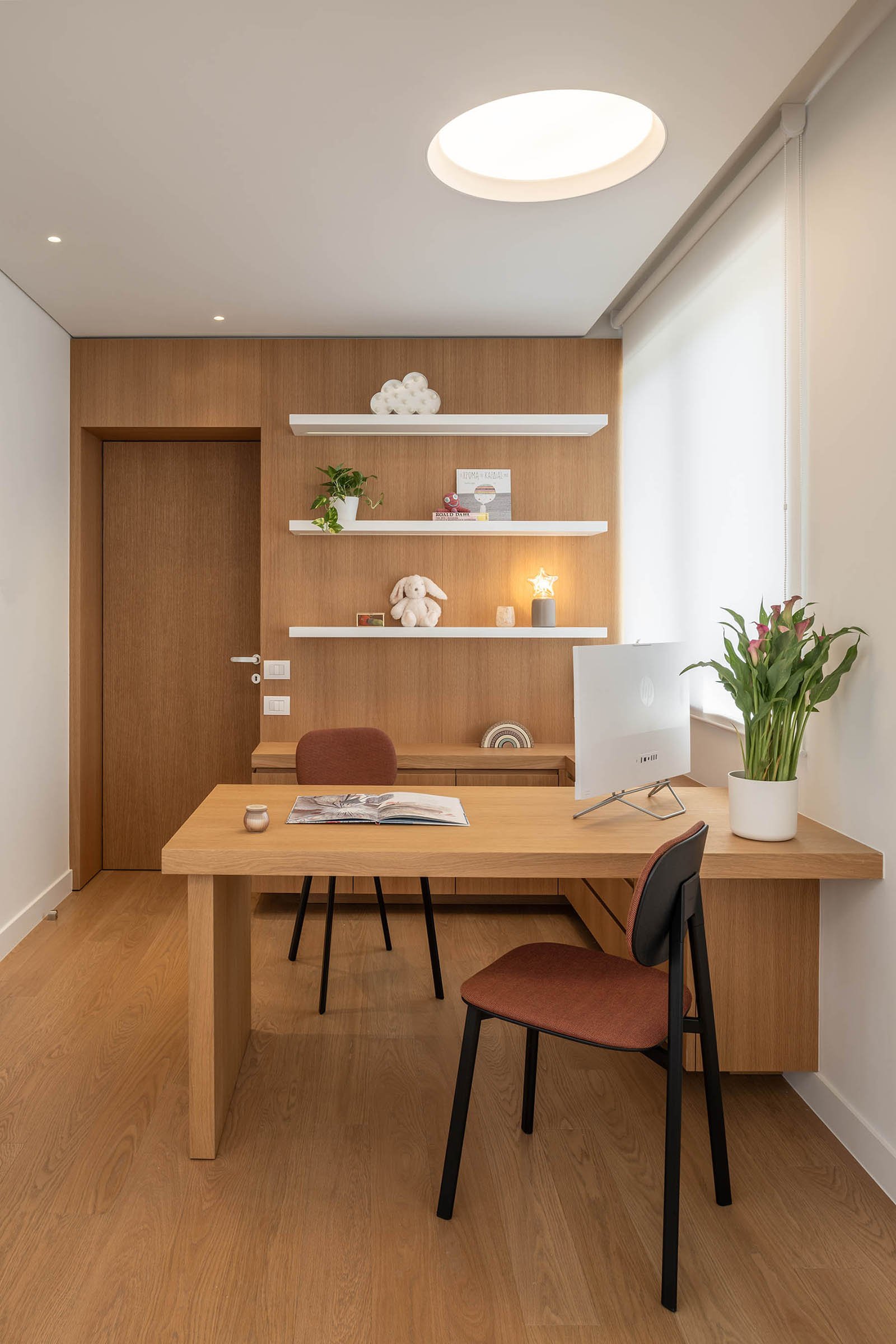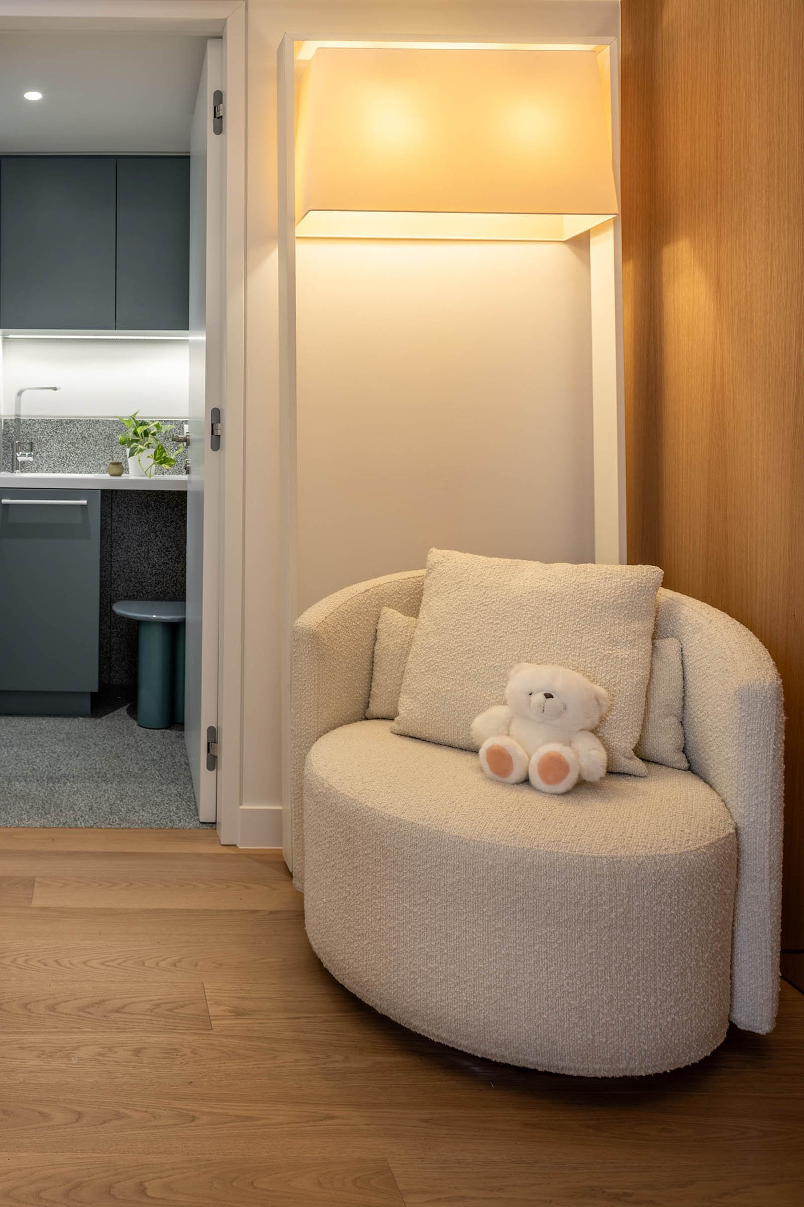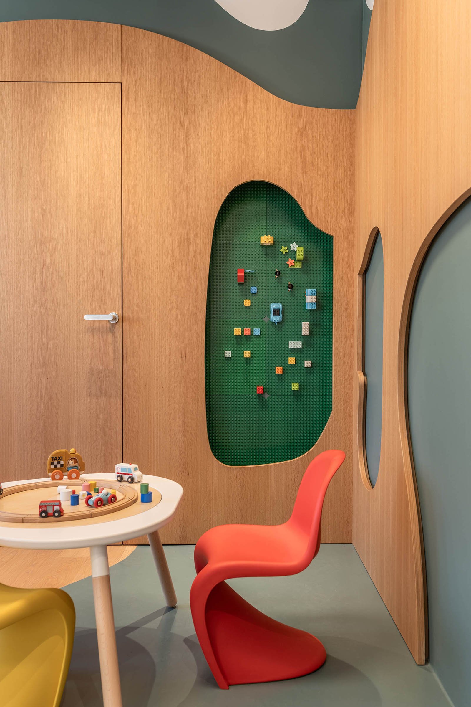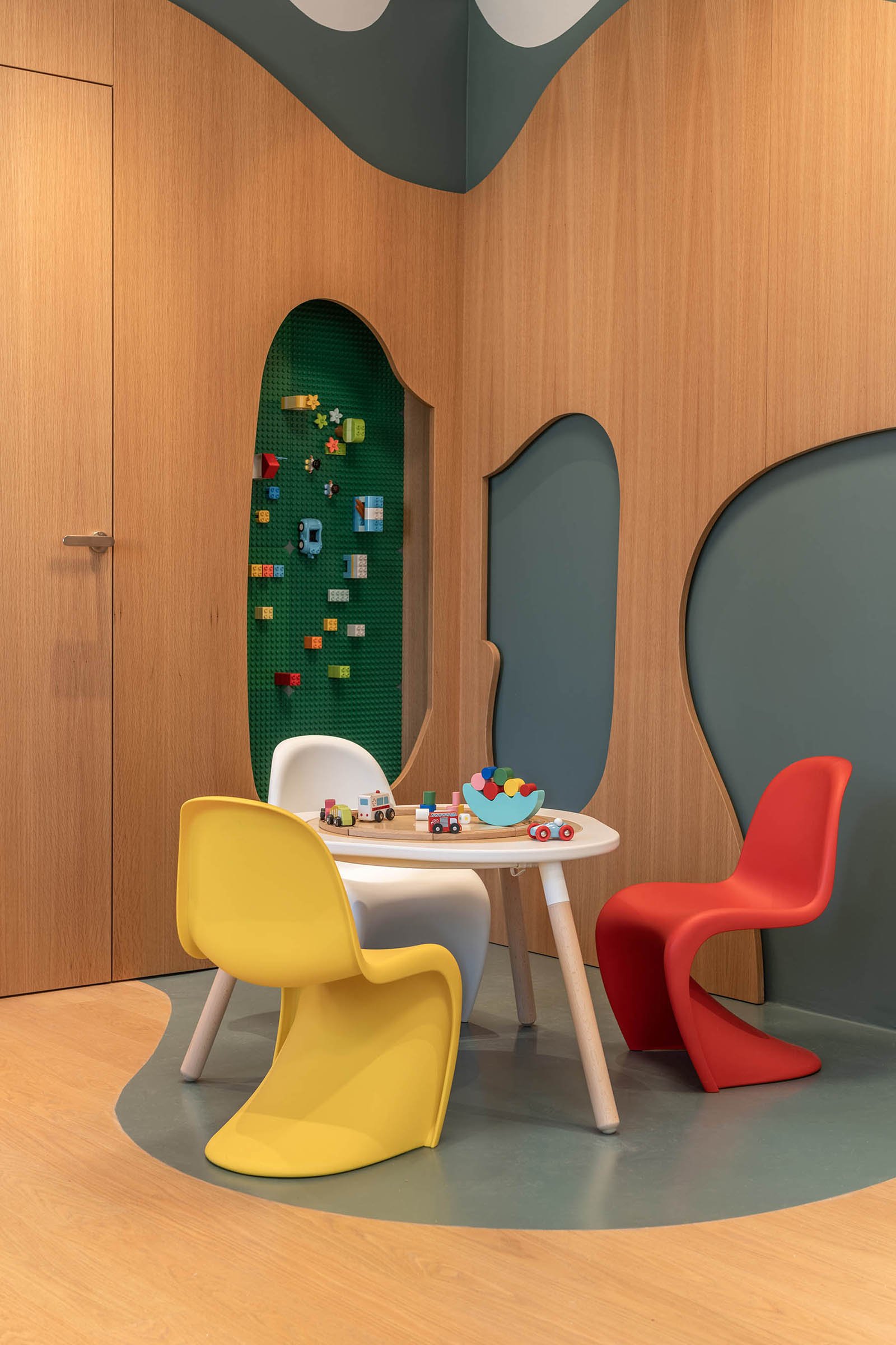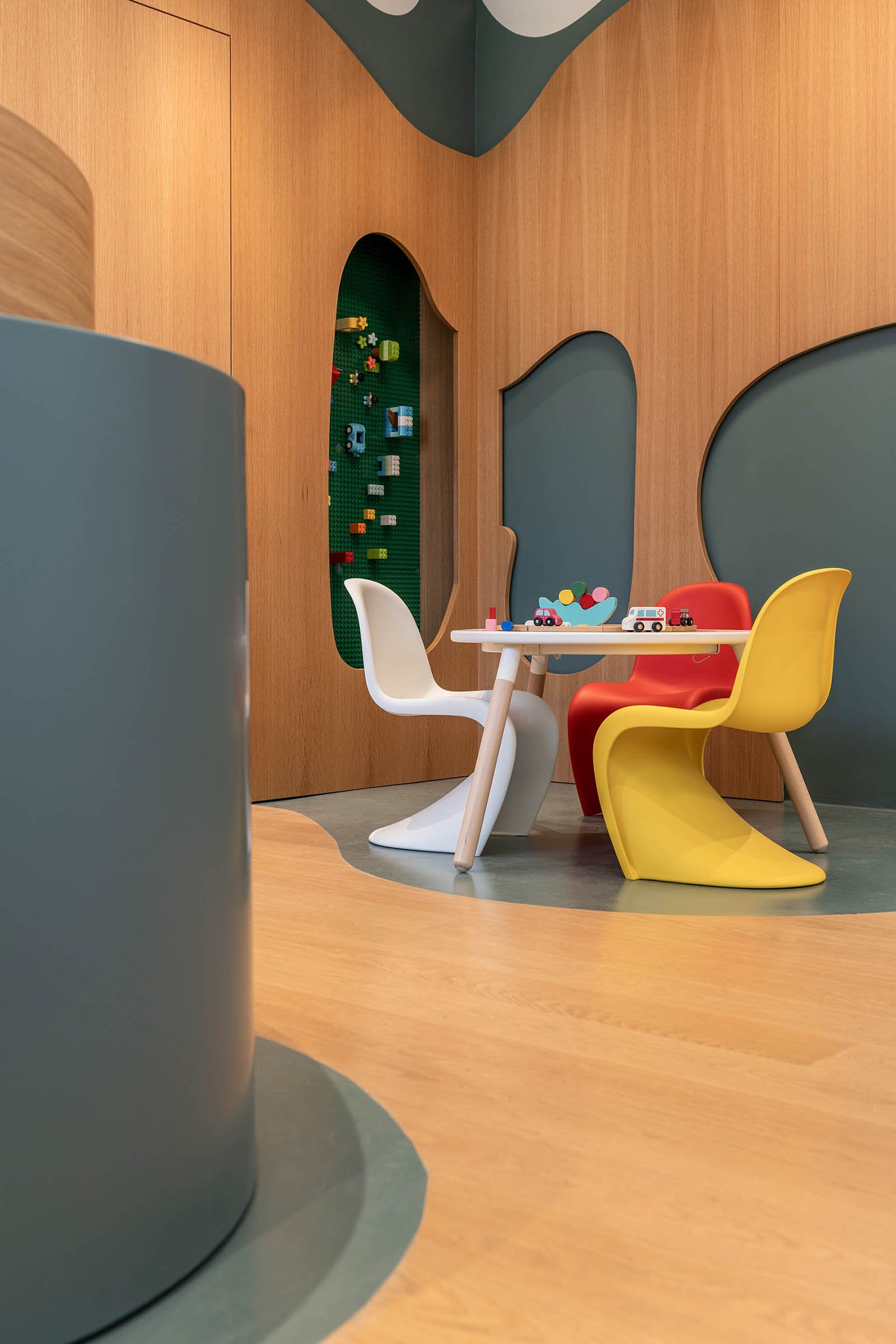 A sculptural, two-layered mural of oak wood and green lacquer spans the main wall. Abstractly evoking a forest, it conceals doors to private spaces while integrating the clinic’s essential storage and library. Custom alcoves along this wall form semi-enclosed, womb-like nooks – spaces for quiet play or retreat that offer physical and emotional shelter. These design gestures create a sense of spatial intimacy while maintaining openness.
