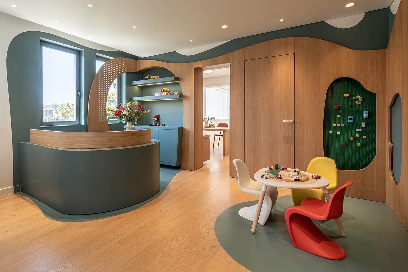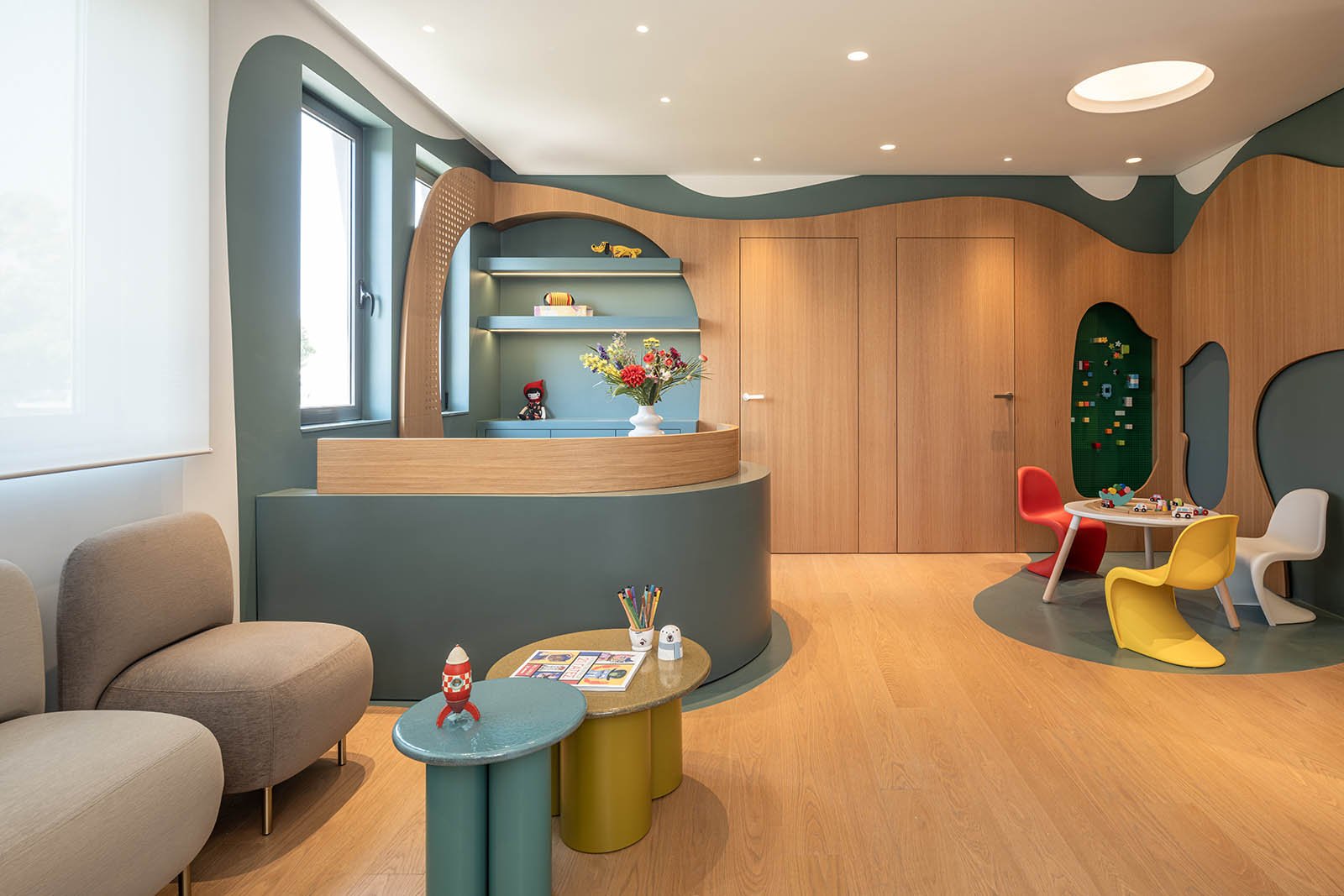 The waiting area becomes a dynamic ‘landscape’ of play, composed of movable seating with organic shapes that invite interaction. These floating, sculptural forms encourage movement, climbing, and casual engagement -turning waiting into an active part of the visit. Parents and children share a space that feels informal, warm, and alive.