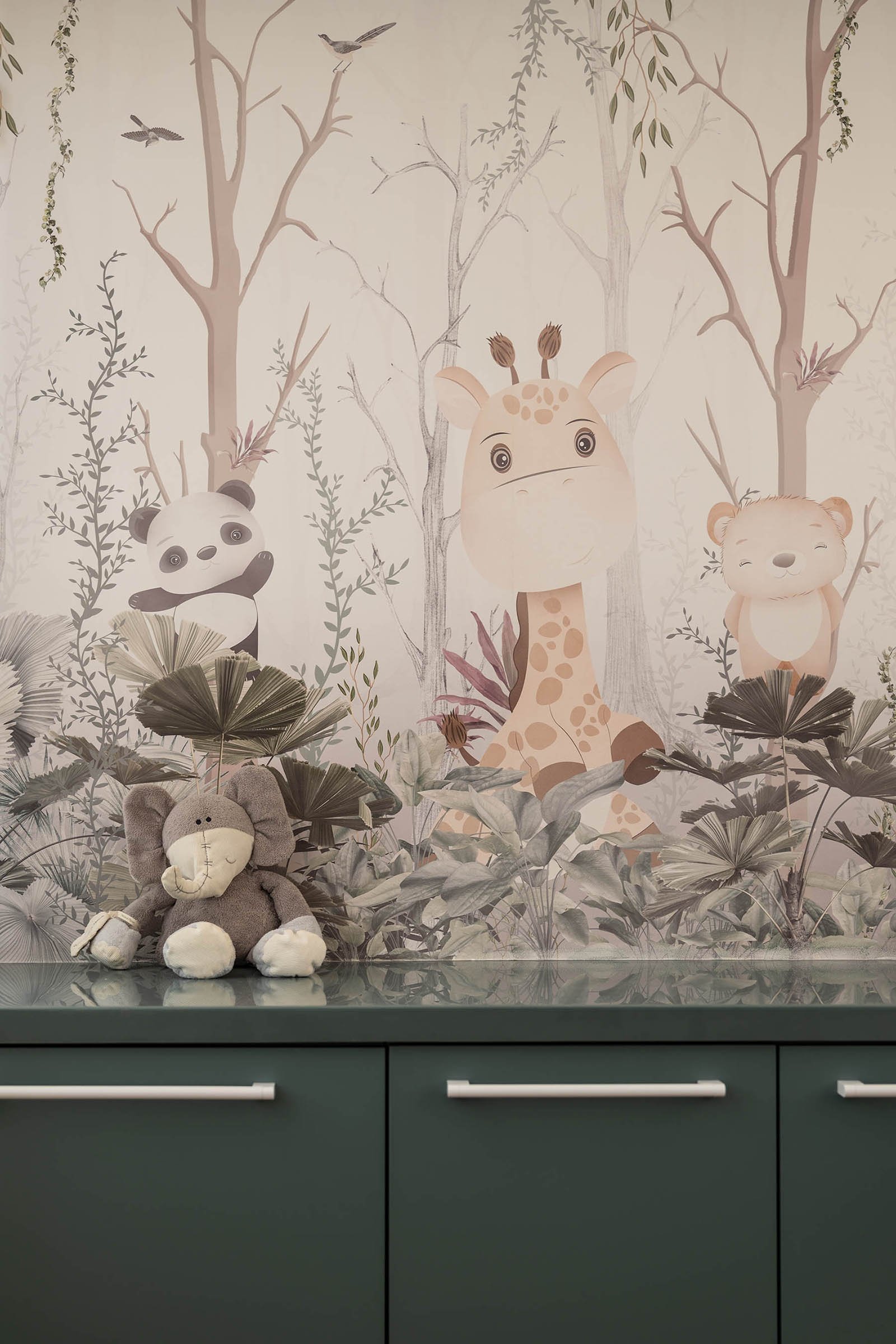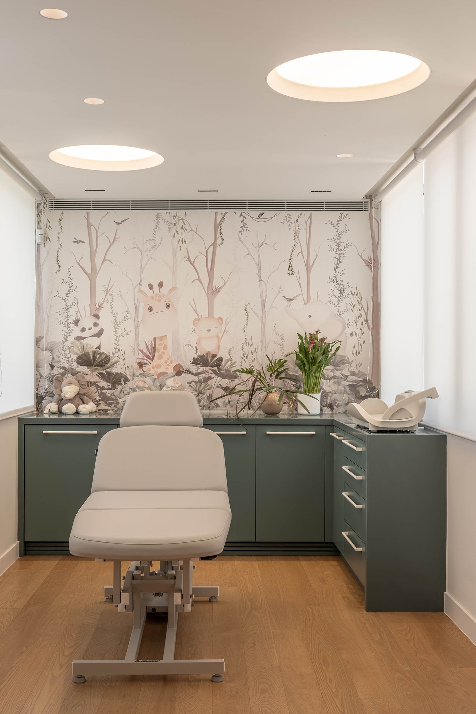 The examination room continues the material language of the public areas – wood cladding, green tones, and soft lighting – ensuring a seamless experience. A thematic wallpaper featuring a forest scene with animals adds both visual comfort and narrative continuity, gently distracting young patients during medical procedures.