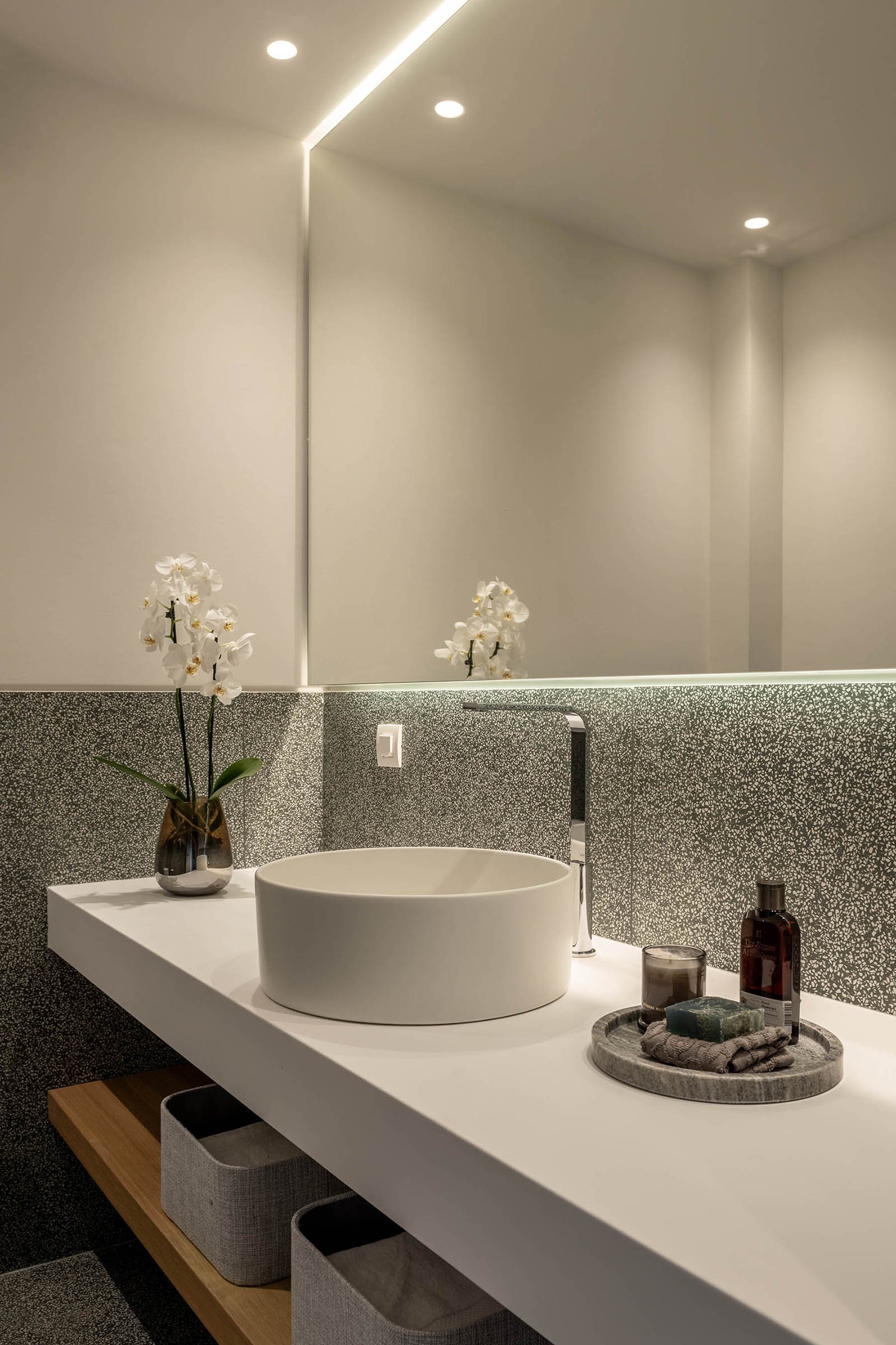 Above, a ceiling composition of circular recesses in soft, matte tones hints at a starry sky. These lights, scattered seemingly at random, provide diffused illumination that shifts attention upward and adds a quiet sense of wonder. Throughout the space, lighting remains indirect and atmospheric, echoing sunlight filtered through leaves – a deliberate move away from harsh, clinical glare.