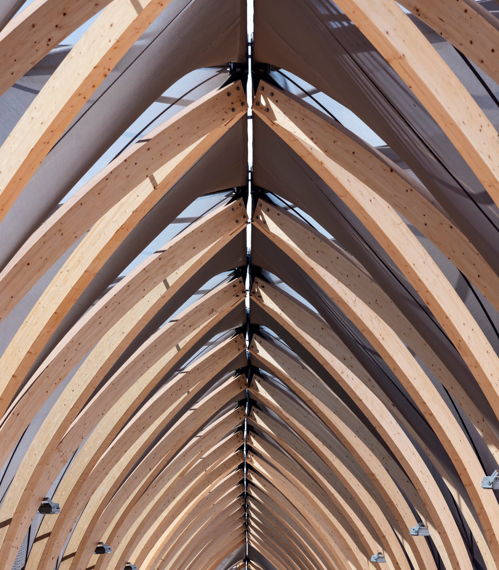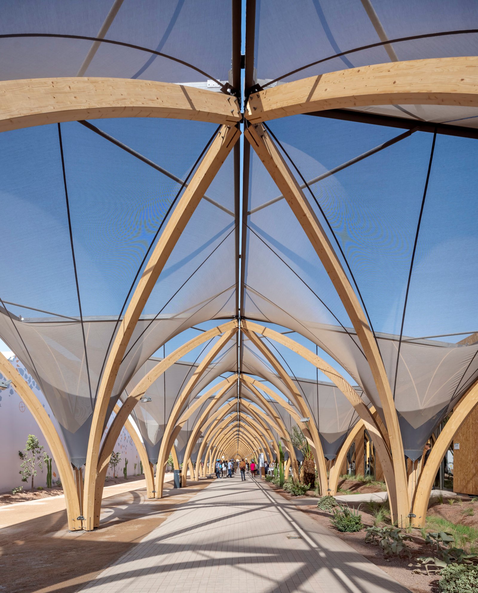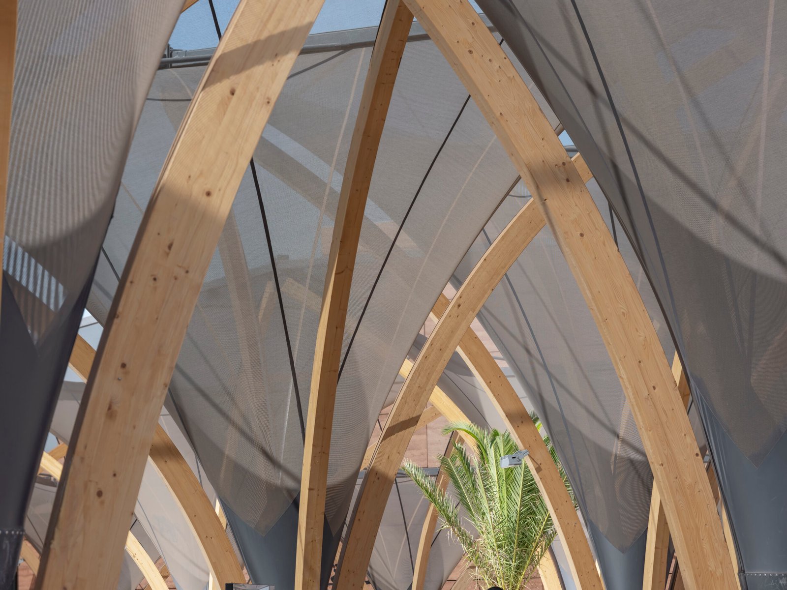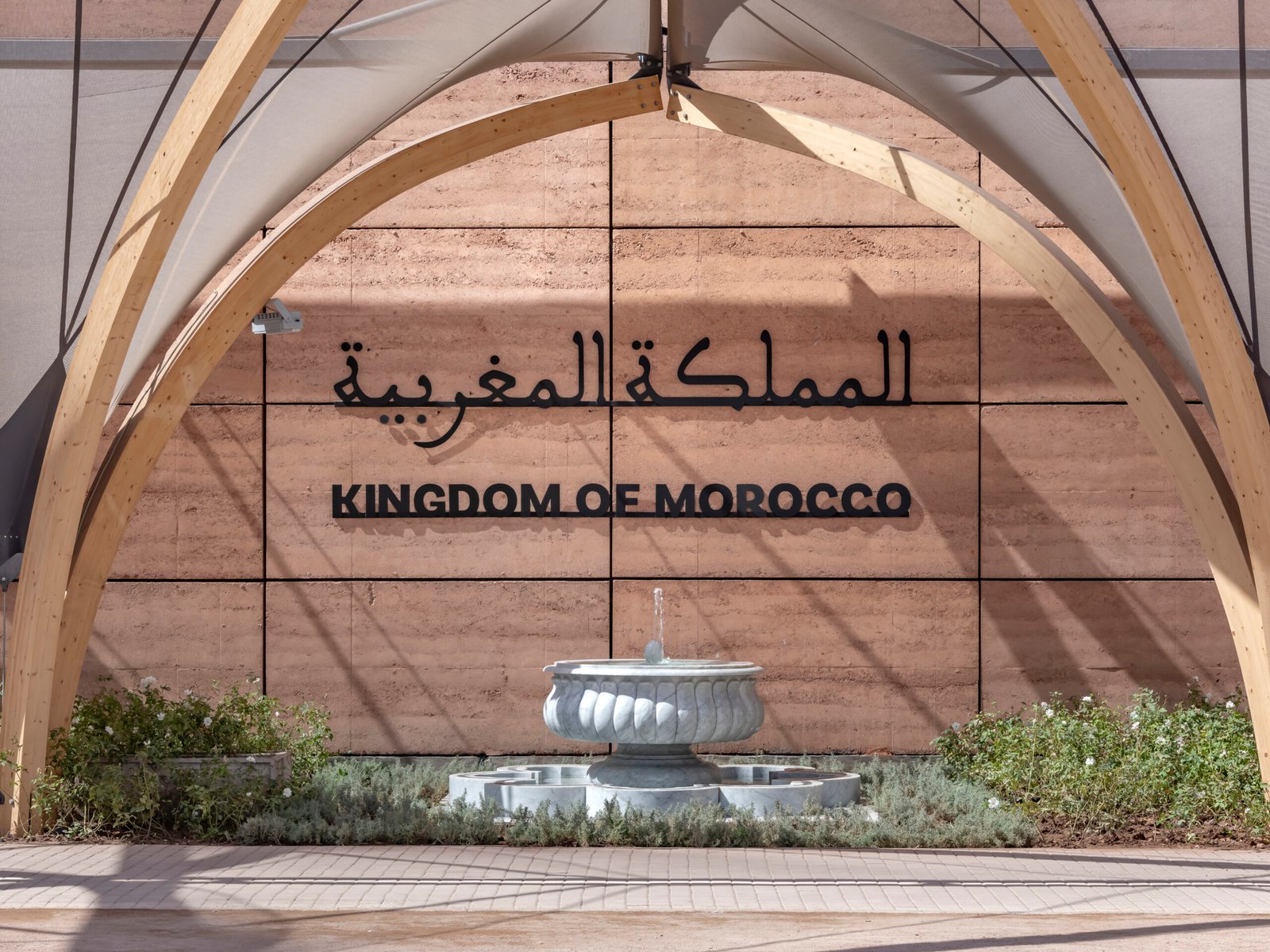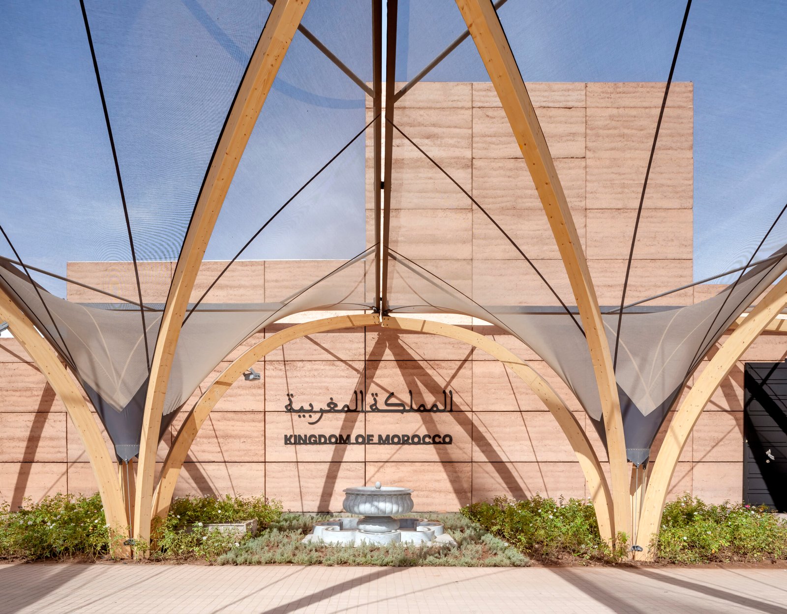 The Moroccan Pavilion, located at the heart of the site on the Town Square, invites visitors to discover the history and cultural richness of Morocco. The pavilion houses a series of exhibition spaces and four Moroccan gardens. Inspired by traditional kasbahs, the building is constructed of local red earth. In response to the extremely limited timeframe for construction, the Moroccan Pavilion is constructed from an innovative method of prefabricated rammed earth panels attached to a steel structure. The arch-shaped passages impart a ceremonial ambiance, while the exposed wooden structure reveals the space’s underlying architectural elements.