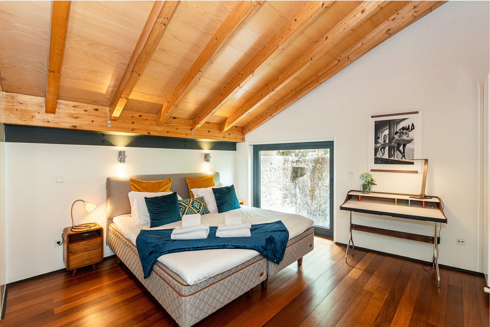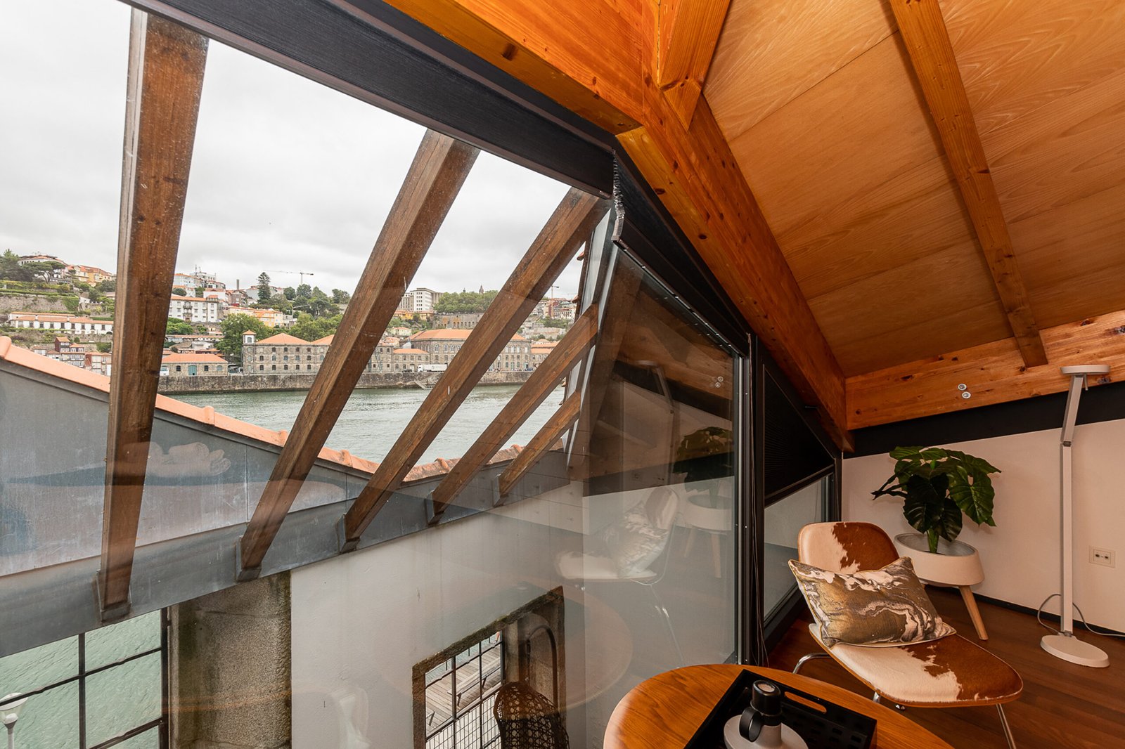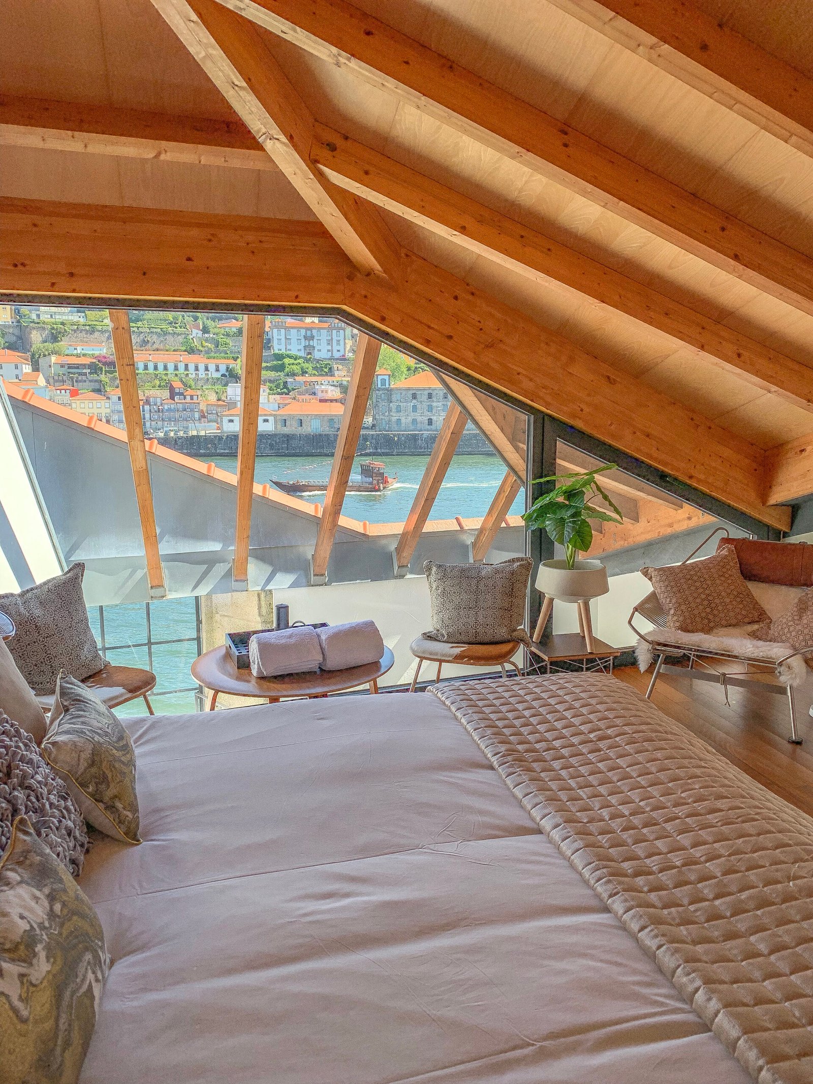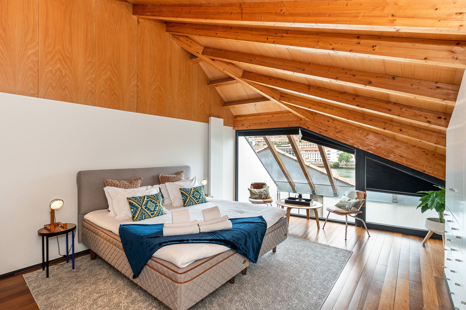 The interiors combine rustic textures with curated details: quilted bedspreads, velvet cushions, natural wood finishes, and artisanal decor that reflect both the artisanal heritage and relaxed elegance of Porto. The top-floor bedroom is particularly dramatic, its sloped ceiling drawing the eye outward to the panoramic landscape. Carefully selected furniture and playful design touches – such as vintage Eames-style chairs and graphic textiles – lend the apartment a welcoming, human scale.