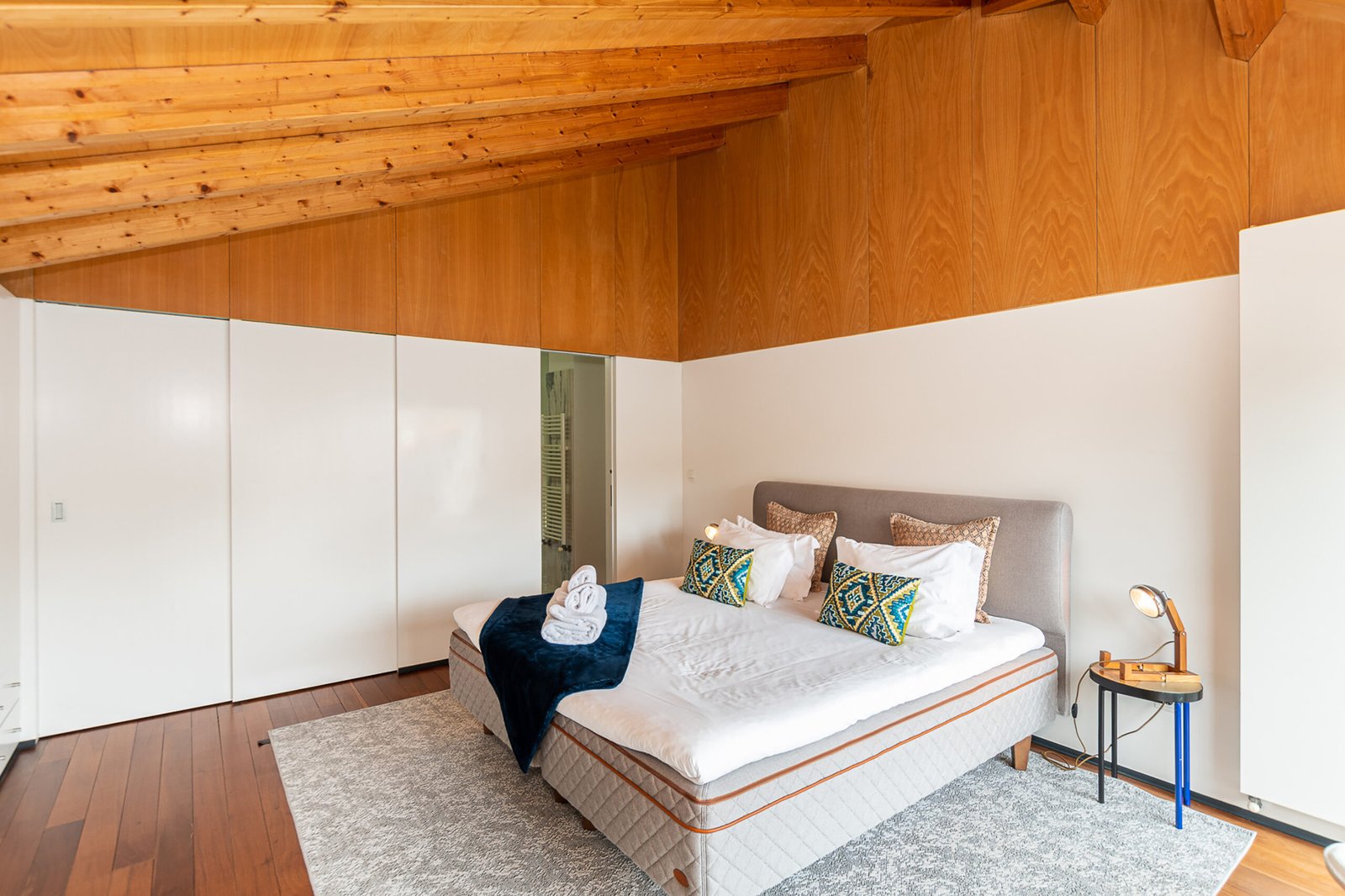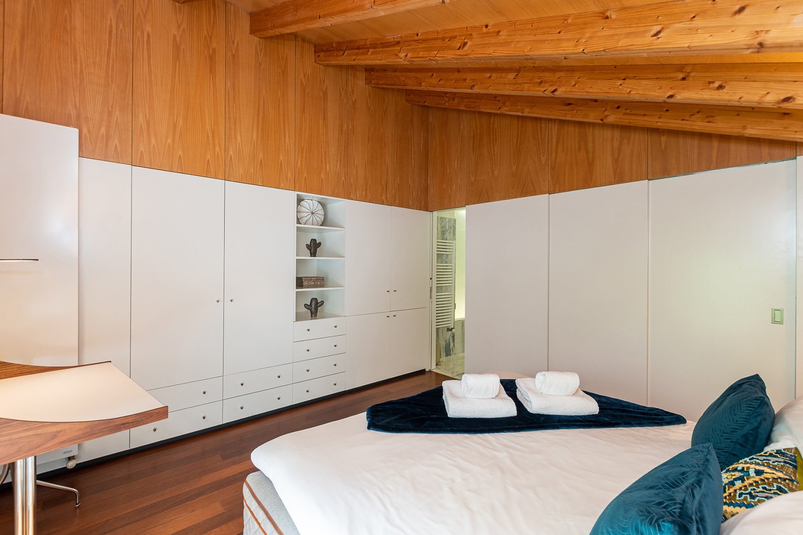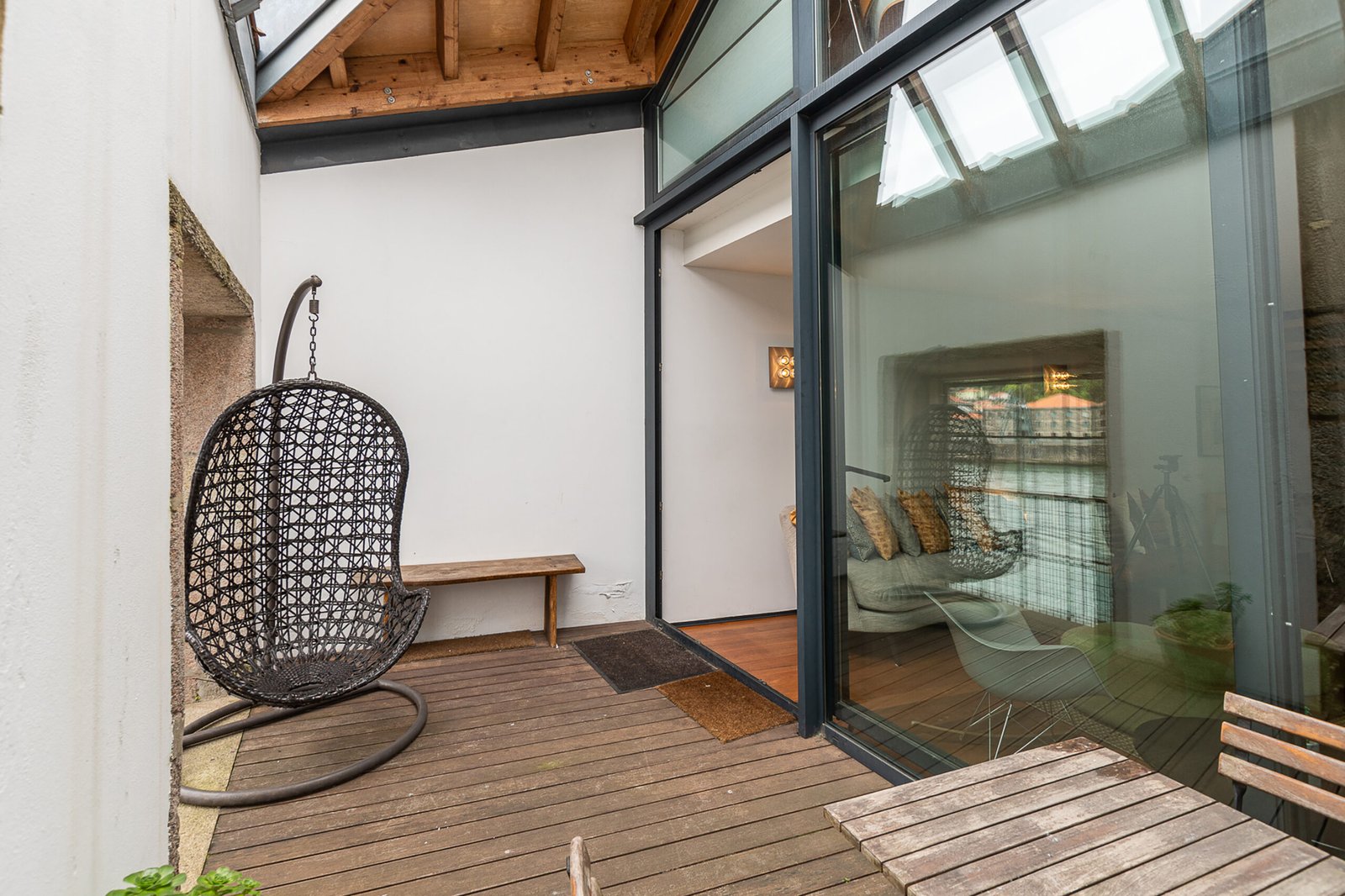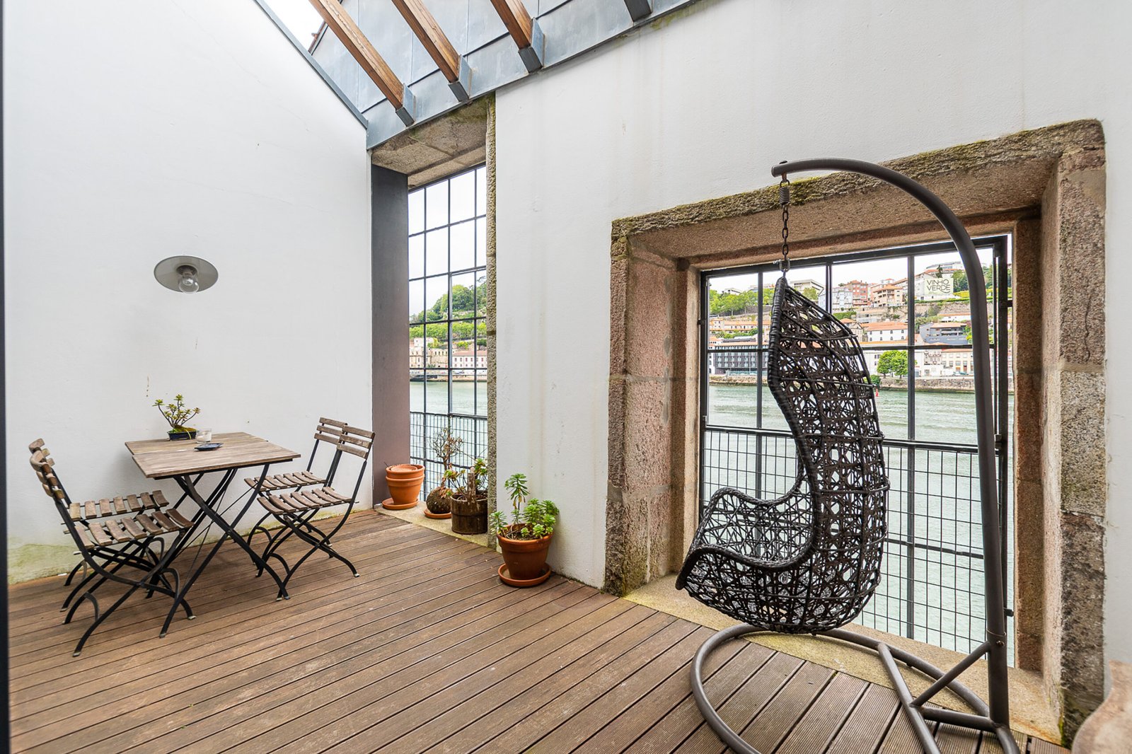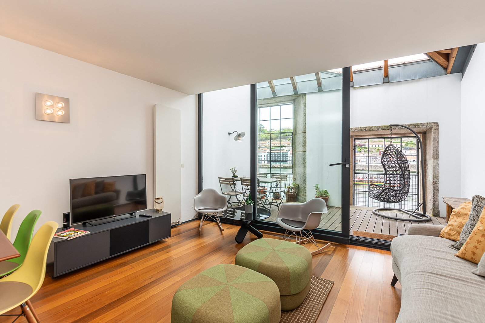 The interiors combine rustic textures with curated details: quilted bedspreads, velvet cushions, natural wood finishes, and artisanal decor that reflect both the artisanal heritage and relaxed elegance of Porto. The top-floor bedroom is particularly dramatic, its sloped ceiling drawing the eye outward to the panoramic landscape. Carefully selected furniture and playful design touches – such as vintage Eames-style chairs and graphic textiles – lend the apartment a welcoming, human scale.