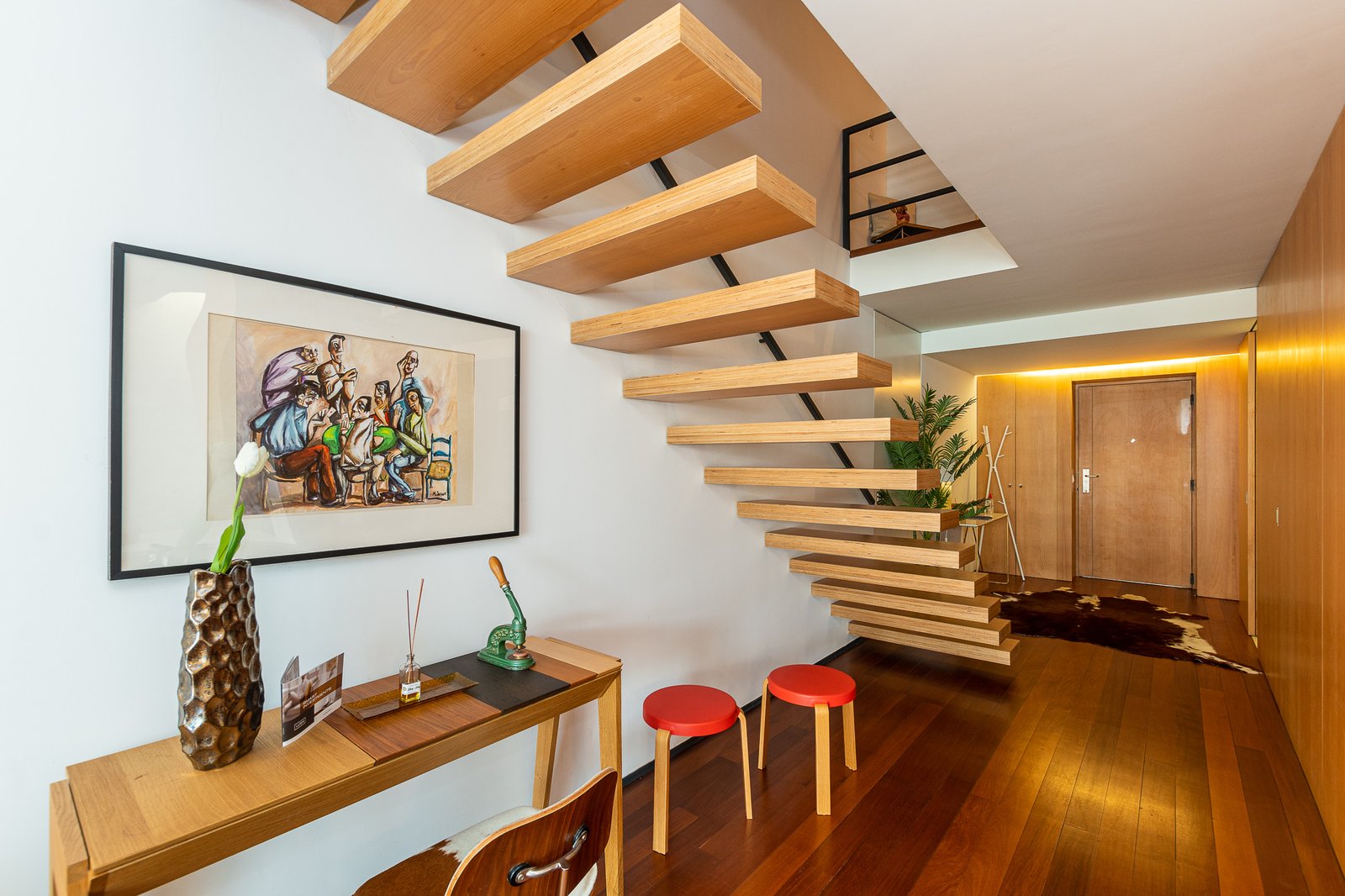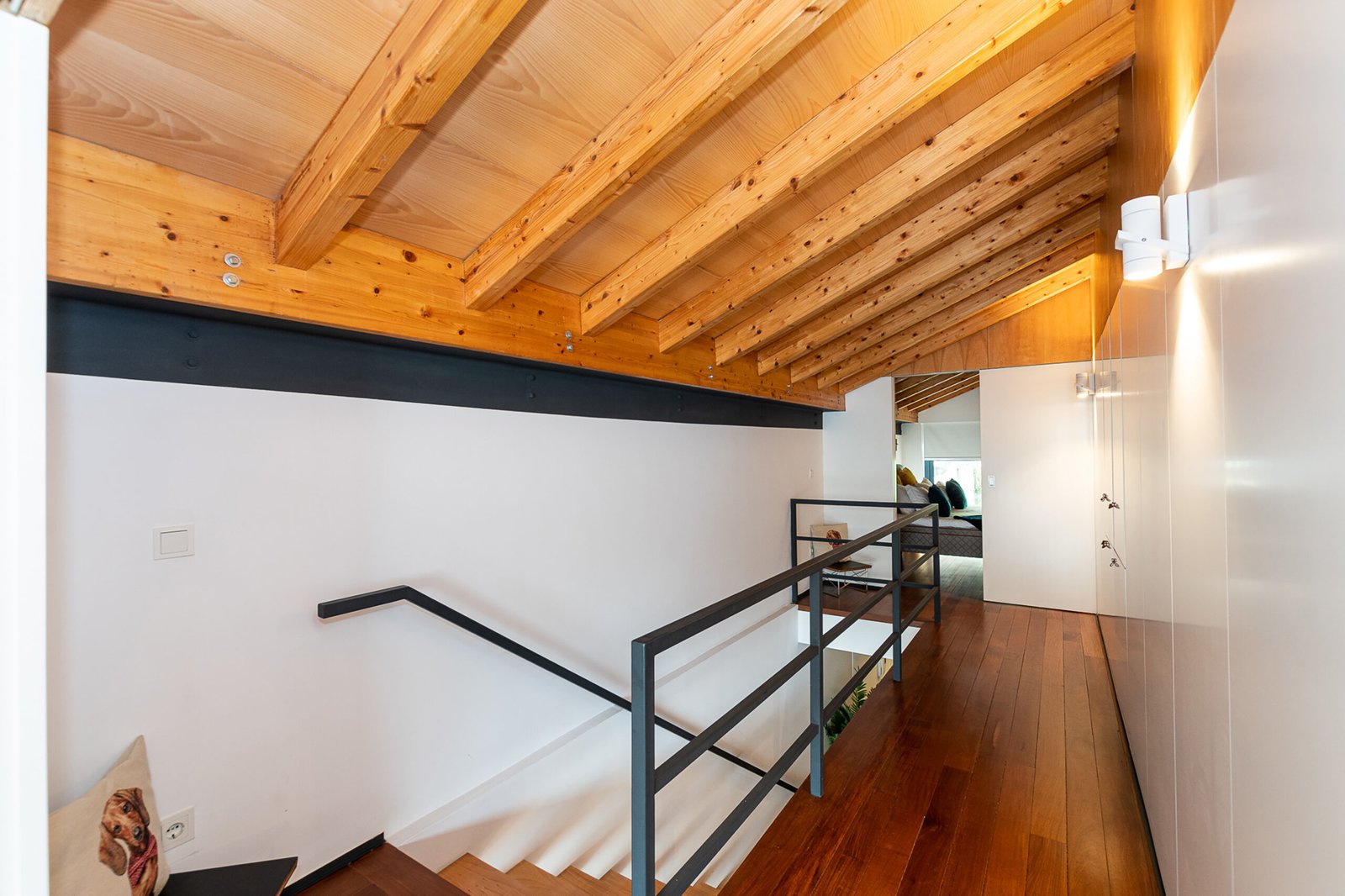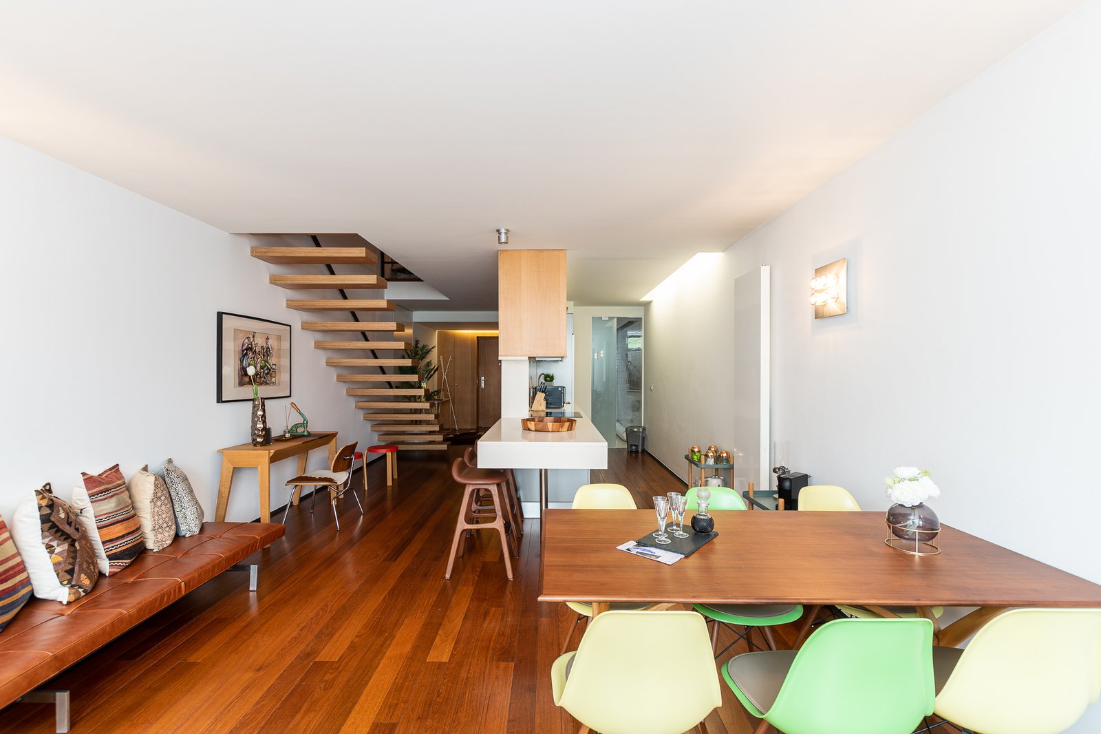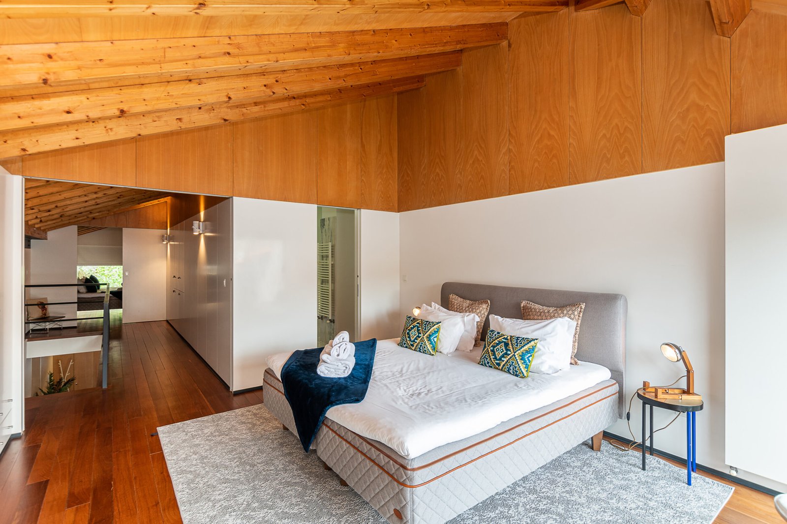 The interiors combine rustic textures with curated details: quilted bedspreads, velvet cushions, natural wood finishes, and artisanal decor that reflect both the artisanal heritage and relaxed elegance of Porto. The top-floor bedroom is particularly dramatic, its sloped ceiling drawing the eye outward to the panoramic landscape. Carefully selected furniture and playful design touches – such as vintage Eames-style chairs and graphic textiles – lend the apartment a welcoming, human scale.