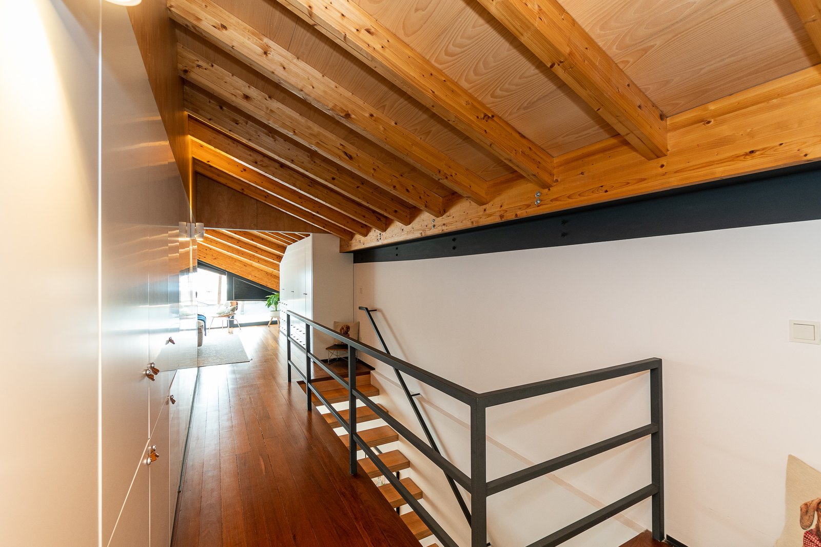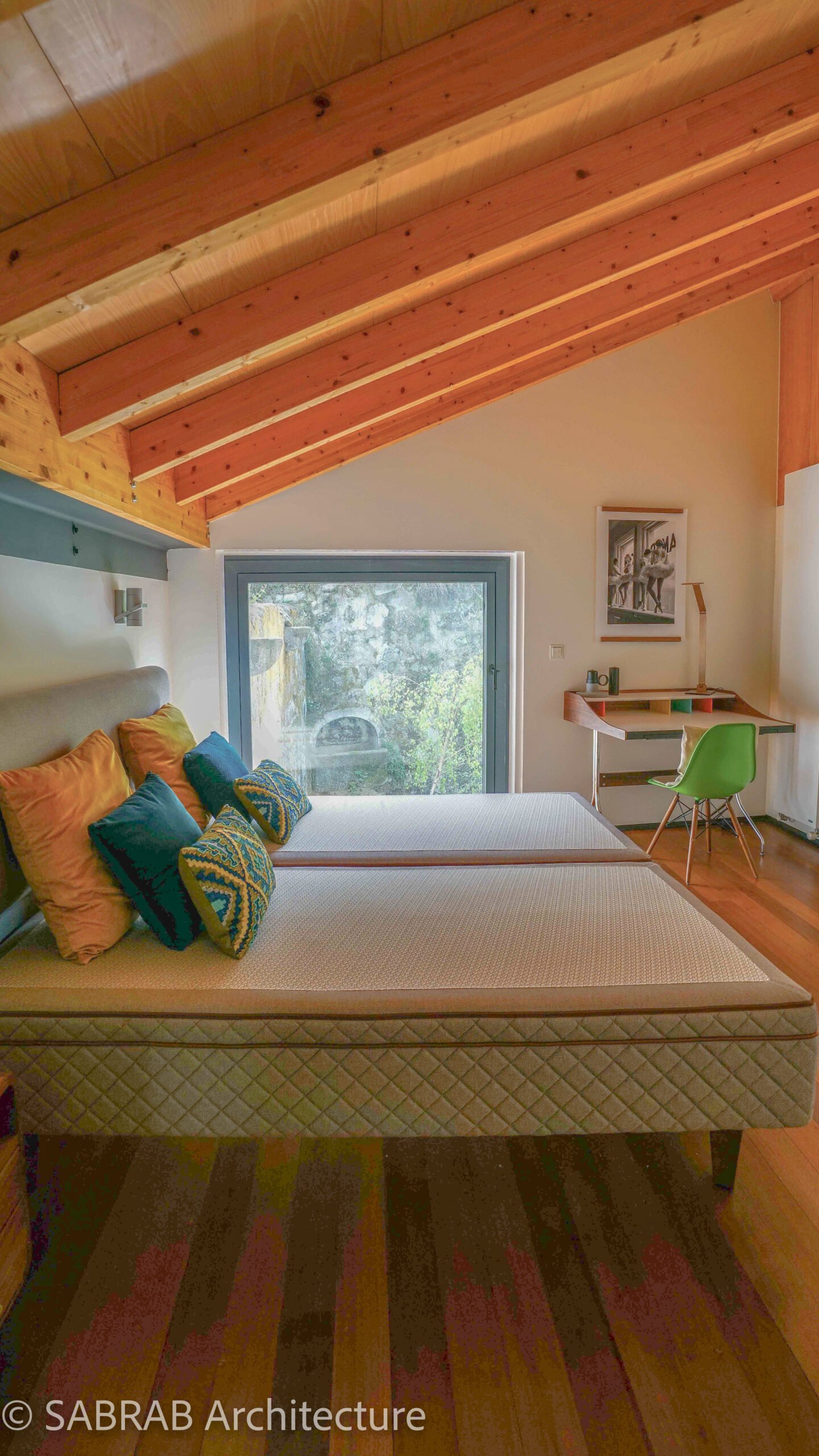SABRAB Architecture preserves the original stone shell and wooden structure while introducing a soft, modern interior marked by clean lines, mid-century furnishings, and a calm palette. The flat is arranged over two levels, with living and dining areas on the lower floor and the sleeping quarters under exposed timber beams on the upper level. Floor-to-ceiling windows and minimalist balconies frame uninterrupted views across the Douro, bringing the river’s rhythm into the daily life of the home.