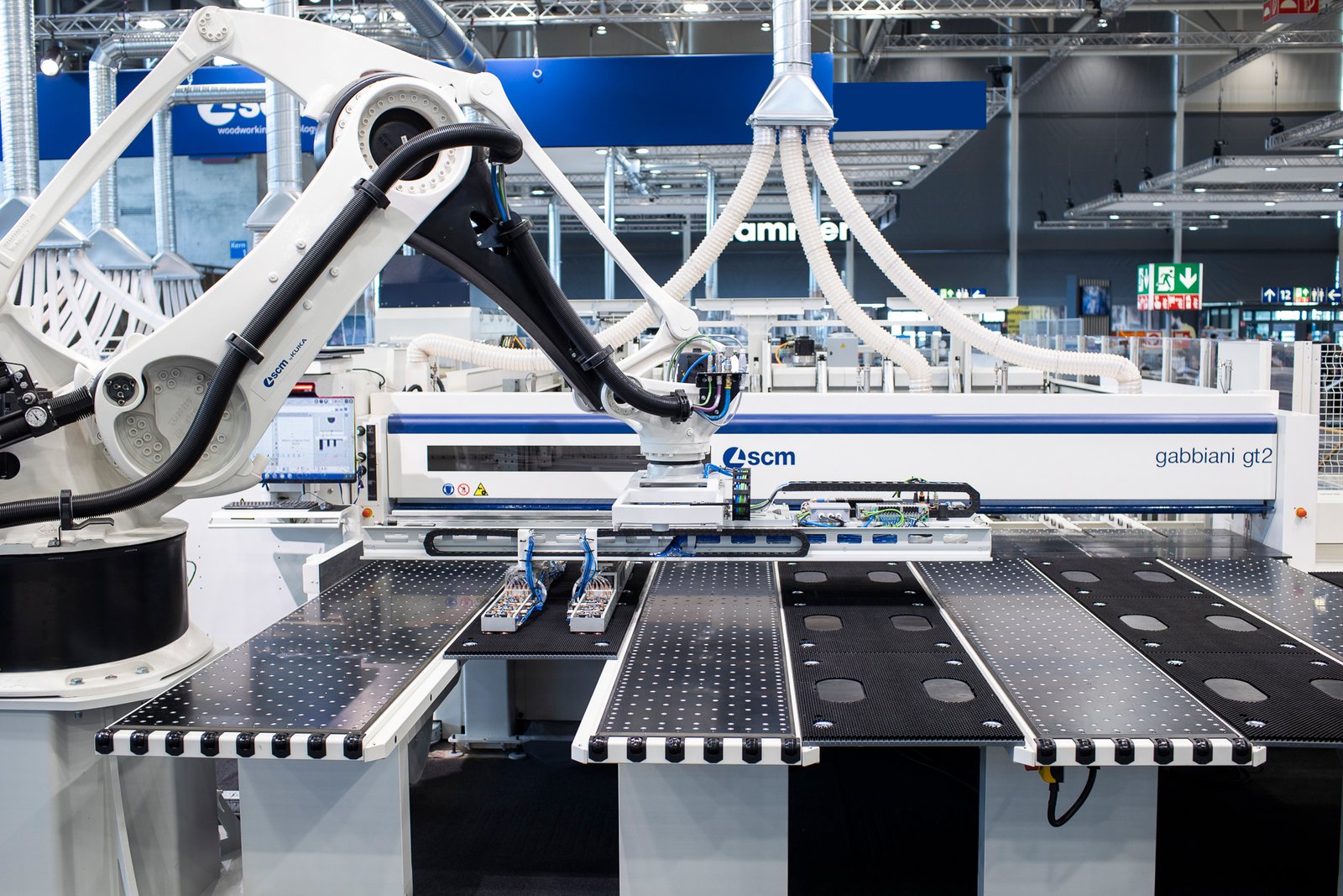 At Rimini Headquarters an Integrated Sizing and Nesting Cell for Batch 1 production will be presented. Combining advanced automation, operational flexibility and reduced energy consumption, the cell is composed of: flexstore hp, the automatic storage system managing all panel formats; gabbiani gt 2 single-blade panel saw; and morbidelli x200 nesting CNC machining center.