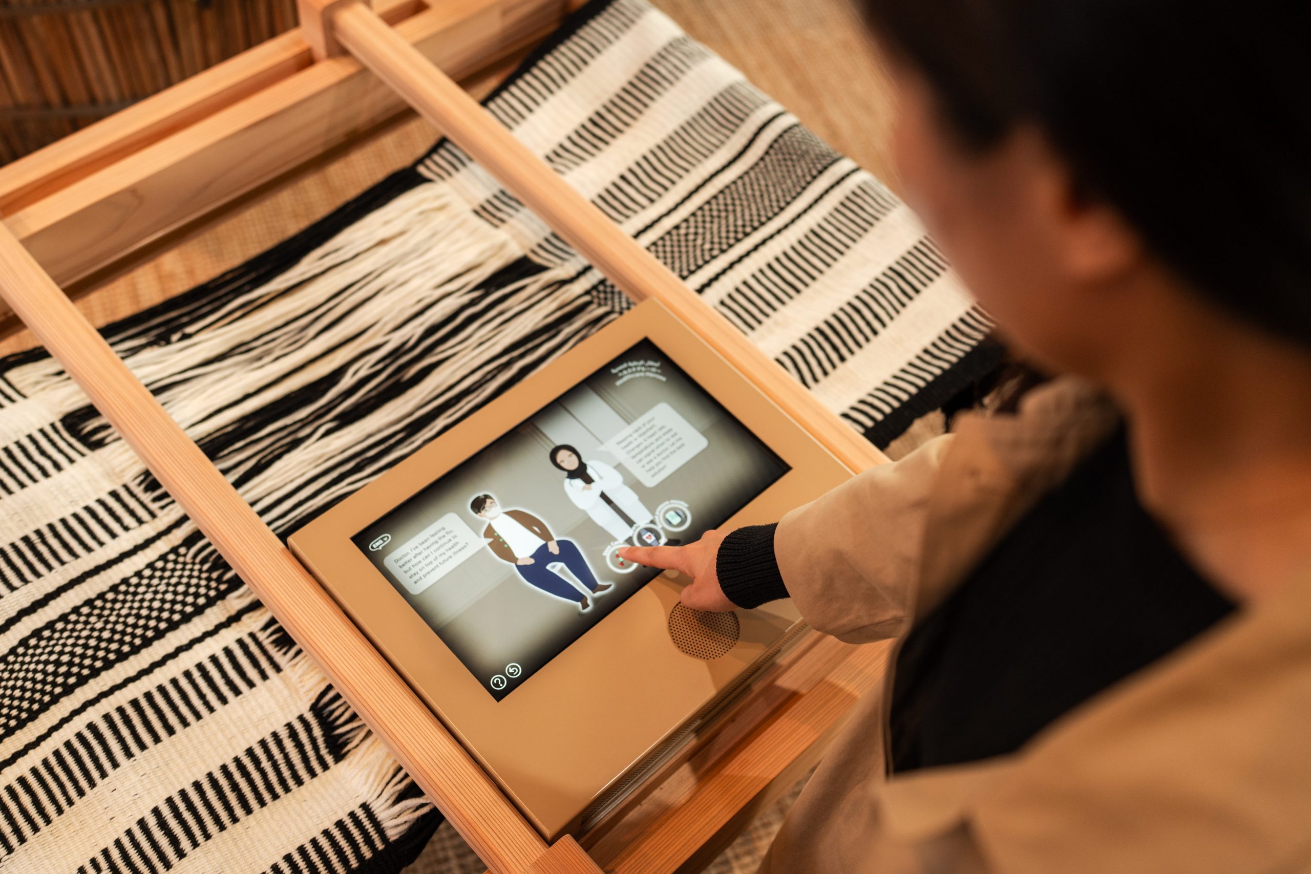 The pavilion’s landscape is a living dialogue between cultures. Japanese satoyama woodlands are represented by oak and red pine trees that frame the front landscape, evoking the harmonious coexistence of nature and people. Guests can enjoy the shade of a pergola made from Japanese cedar, paired with a canopy featuring Emirati khoos patterns, a traditional form of palm-frond weaving. Moreover, the pavilion’s outdoor furniture artfully combines recycled agricultural date palm waste and Dateform, a pioneering date seed-based material from the UAE.